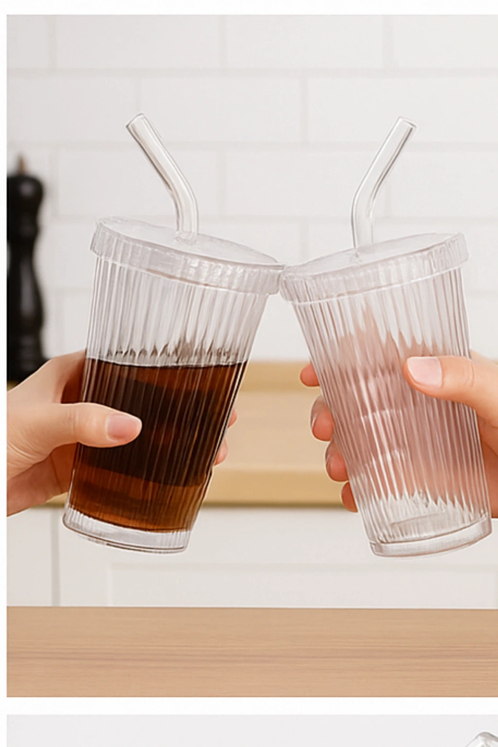 2 Adet Latte Kapaklı Pipetli Kristal Desen Fenomen Bardak Soğuk Kahve, Smoothie, İçecek Bardağı