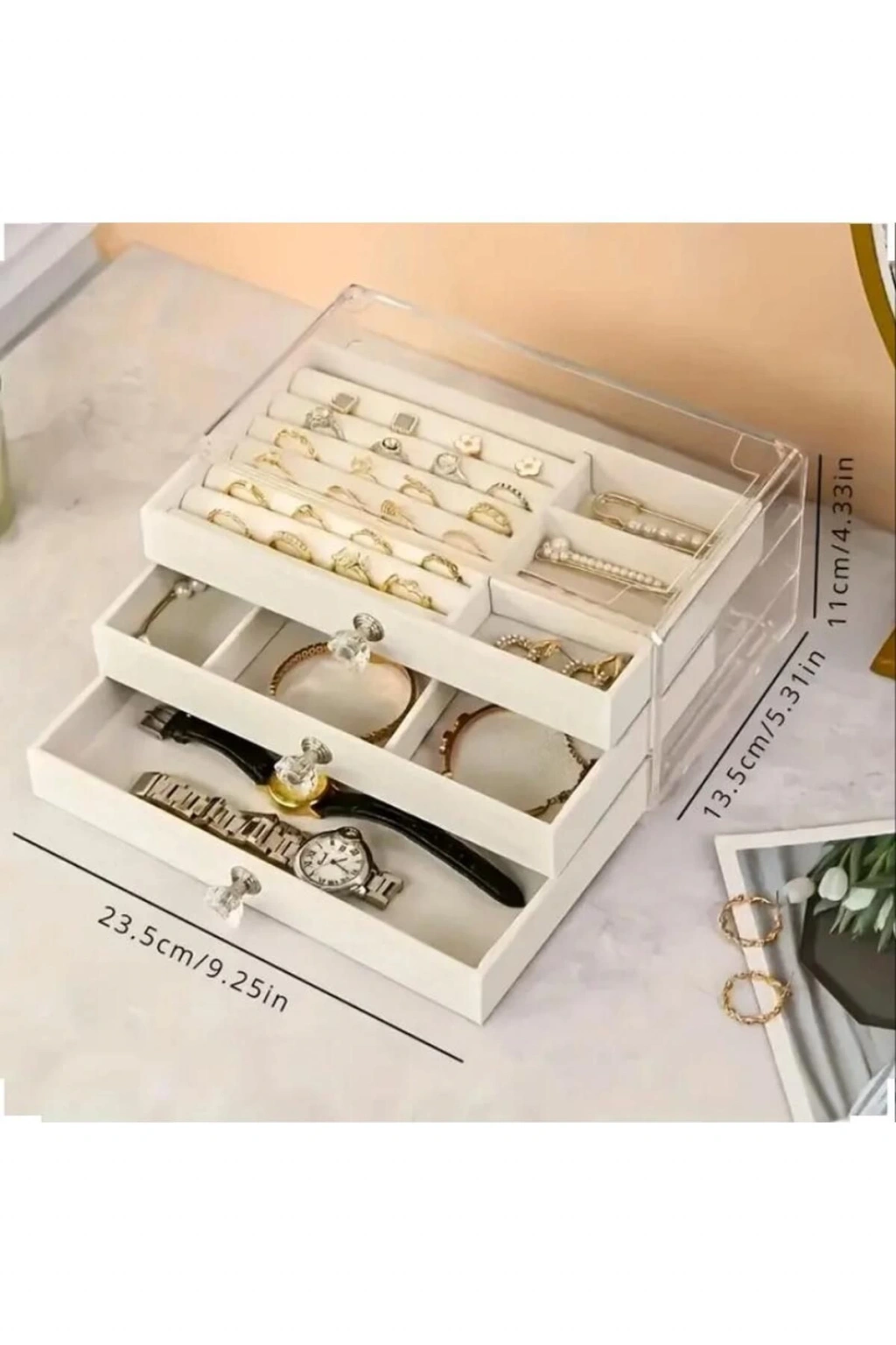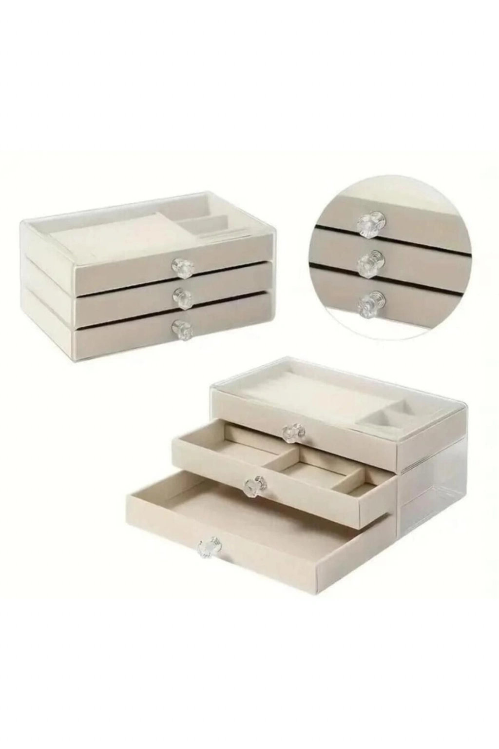3 Çekmeceli Bölmeli Şeffaf Takı Kutusu | Mücevher Saklama Kutusu Krem Renk Seçeneği