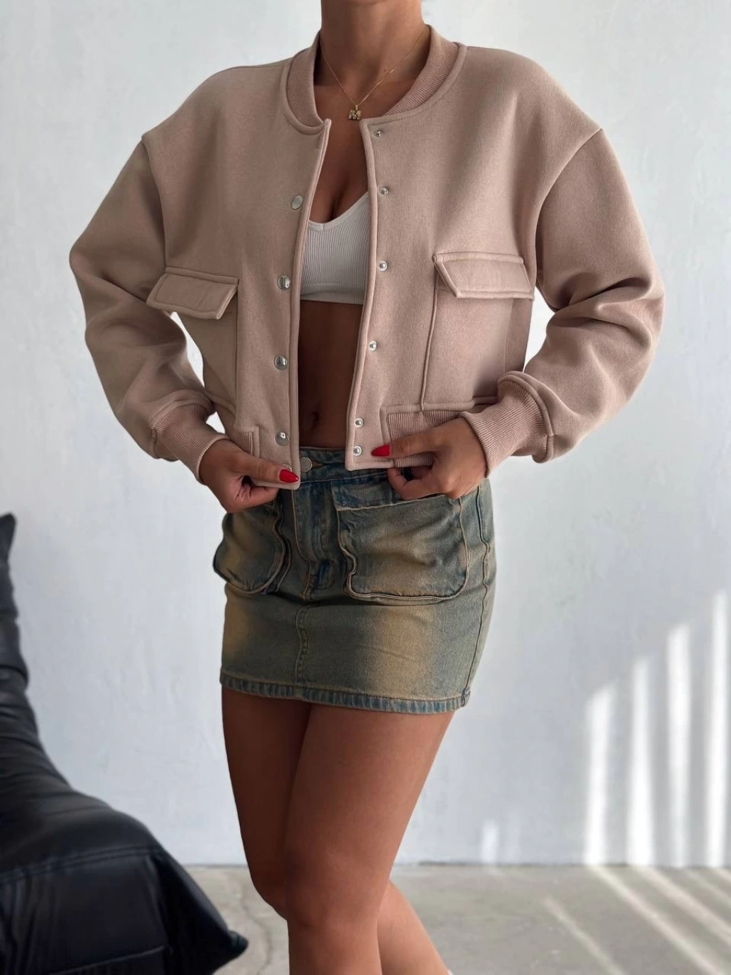 3 iplik şardonlu Önü çıtçıtlı cepli ceket bej f2226