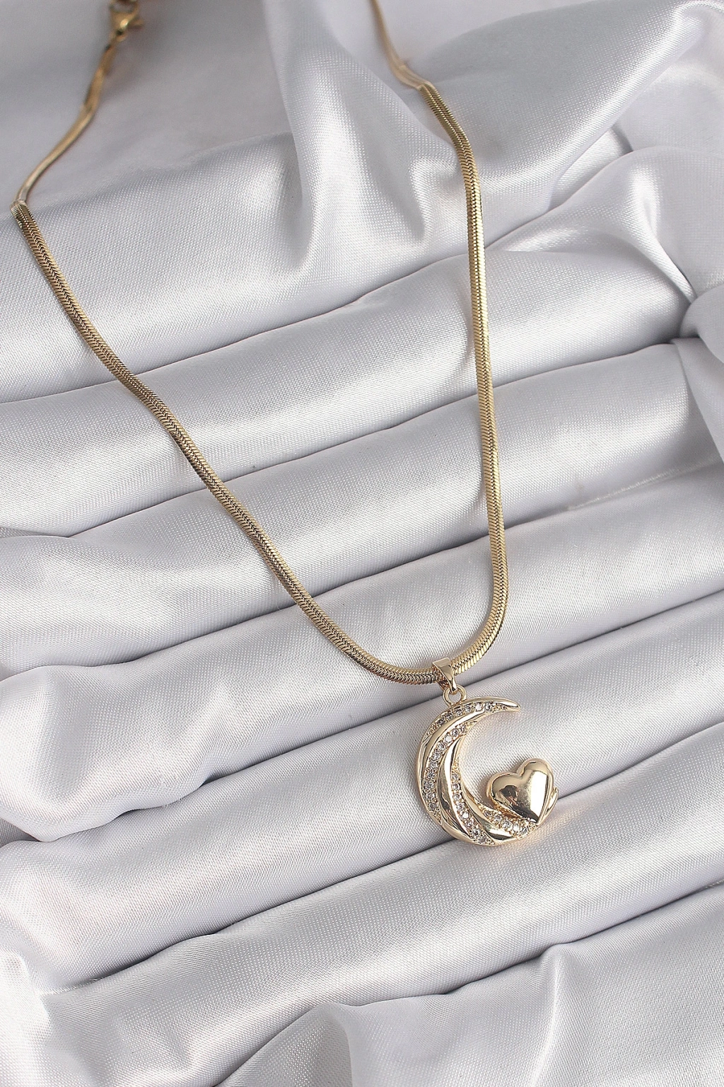 316L Çelik Gold Renk Çelik İtalyan Zincir Zirkon Taşlı Halil Figür Kalp Detay Kadın Kolye