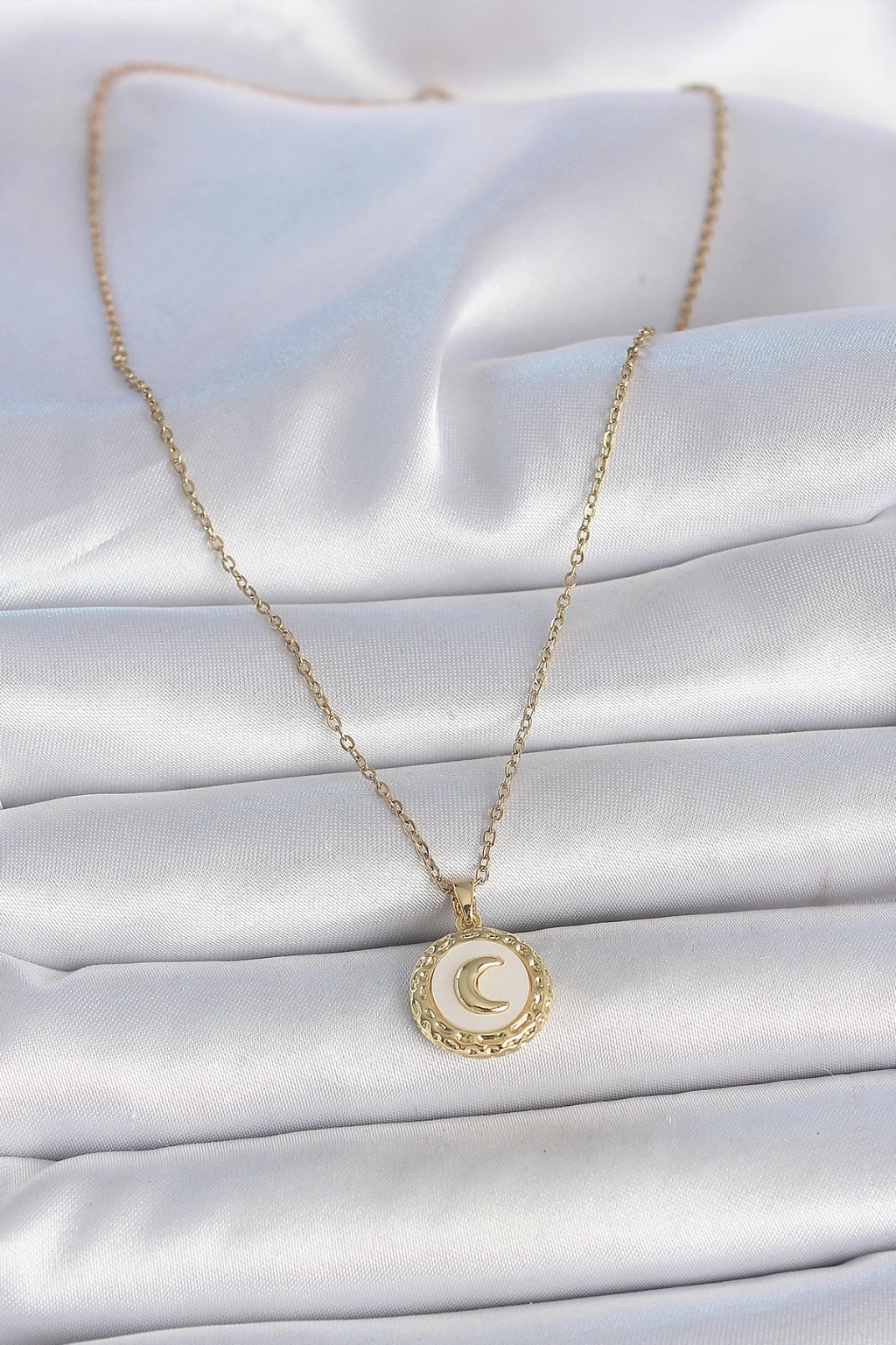 316L Çelik Gold Renk Zincir Beyaz Mineli Hilal İşlemeli Madalyon Model Kadın Kolye