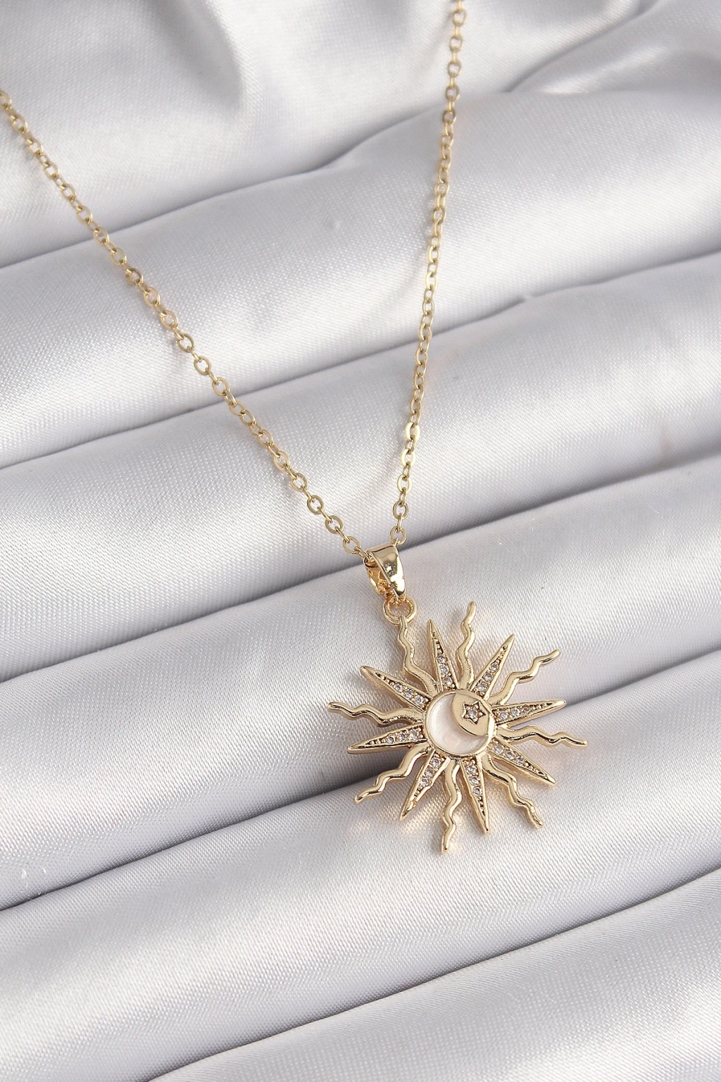 316L Çelik Gold Renk Zincir Renkli Zirkon Taşlı Sedefli Ay İşleme Detay Kadın Kolye