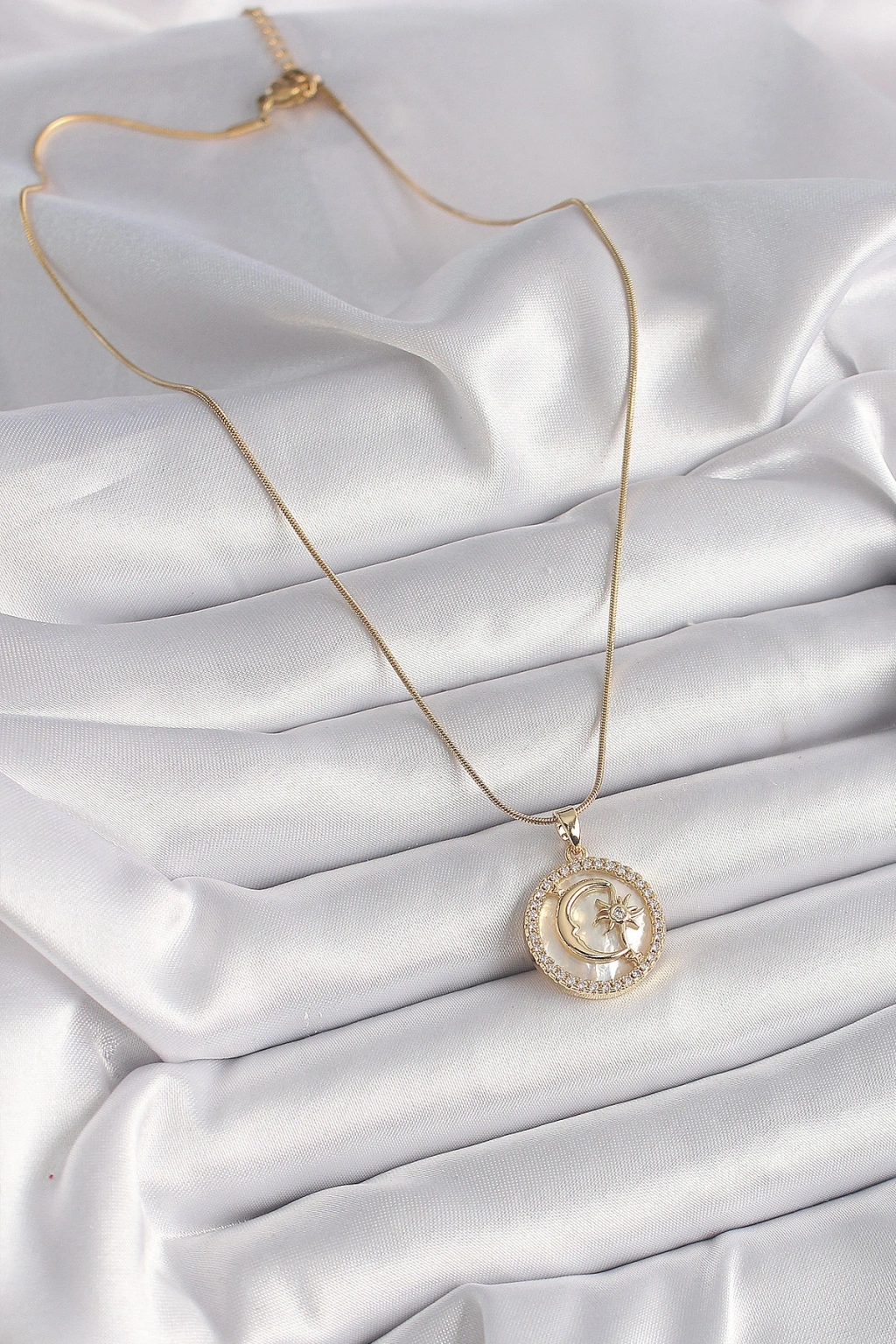 316L Çelik Gold Renk Zincir Zirkon Taş Detaylı Beyaz Sedefli Ay Yıldız Model Kadın Kolye