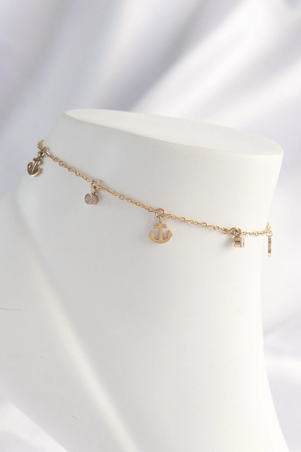 316L Çelik Gold Renk Zirkon Taşlı Minimal Çapa Tasarımlı Halhal