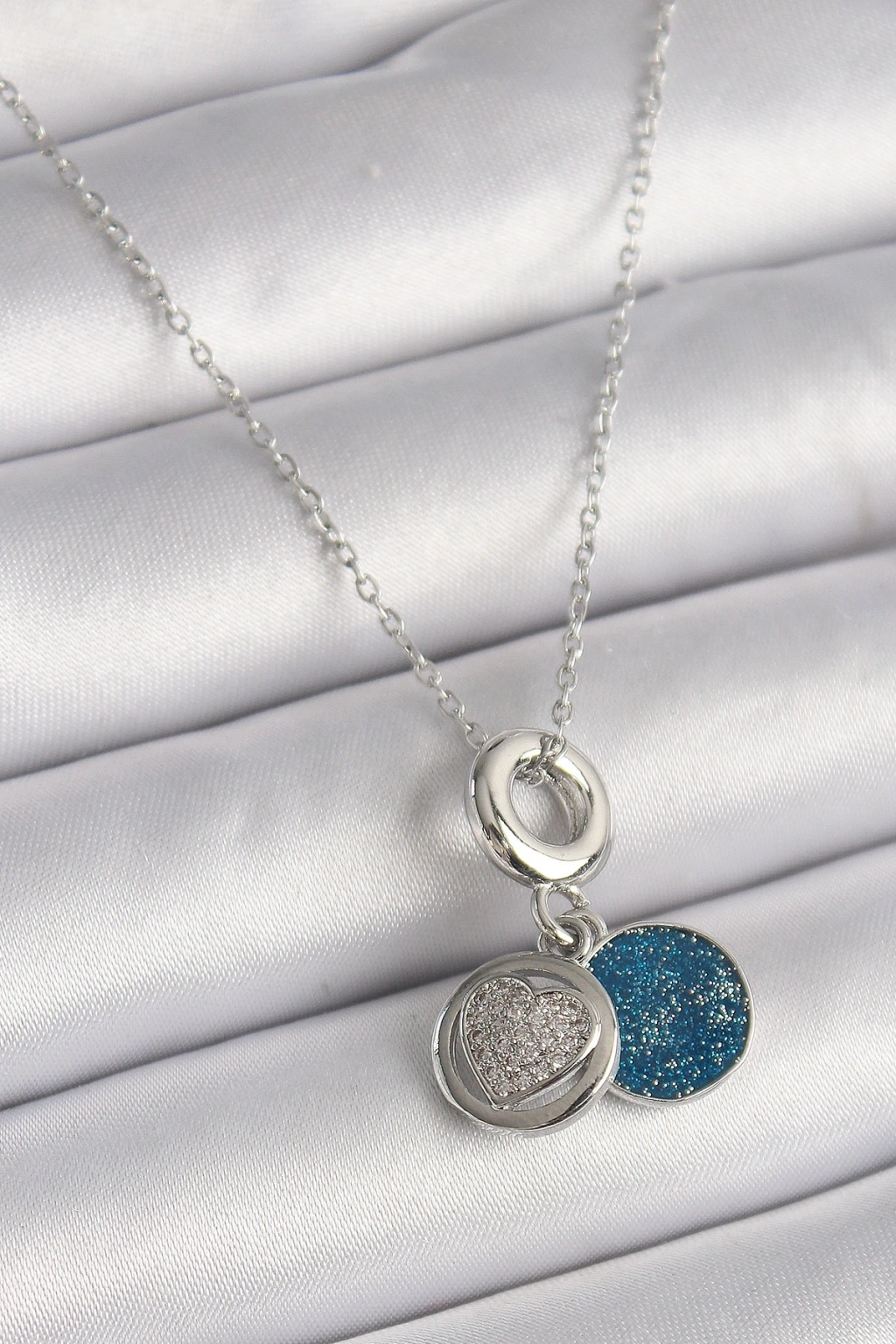 316L Çelik Gümüş Renk Zincir Zirkon Taşlı İşleme Mavi Simli Kadın Kolye