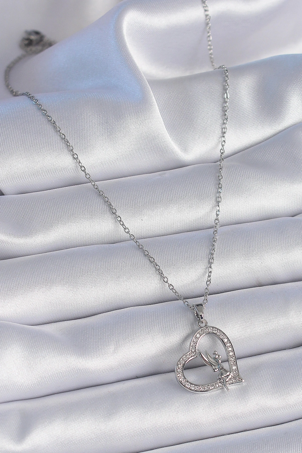 316L Çelik Zincir Gümüş Renk Zirkon Taşlı Kalp Model Melek Detay Kadın Kolye