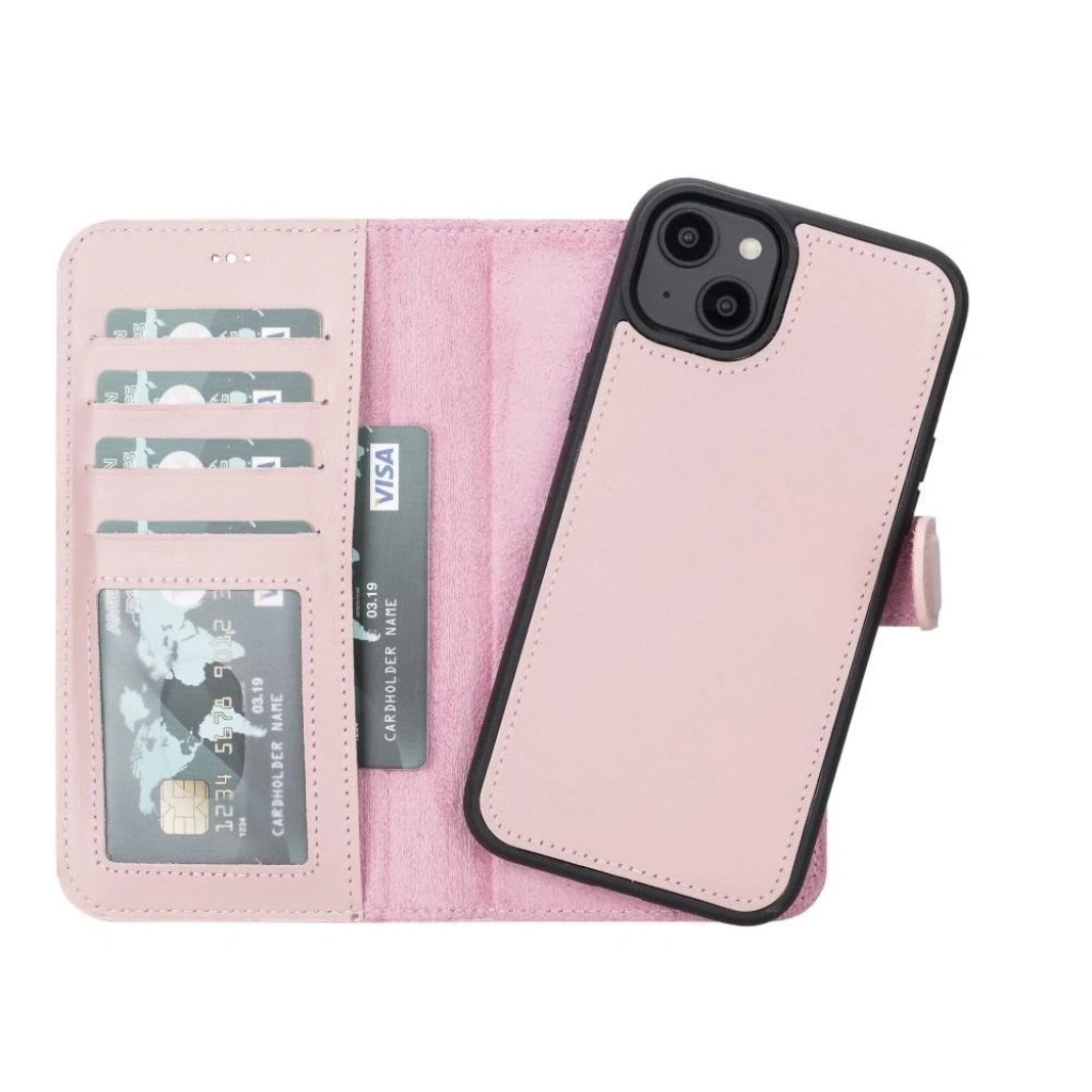 Apple iPhone 16 uyumlu, Hakiki Deri, El Yapımı, Cüzdanlı Kılıf, Toz Pembe