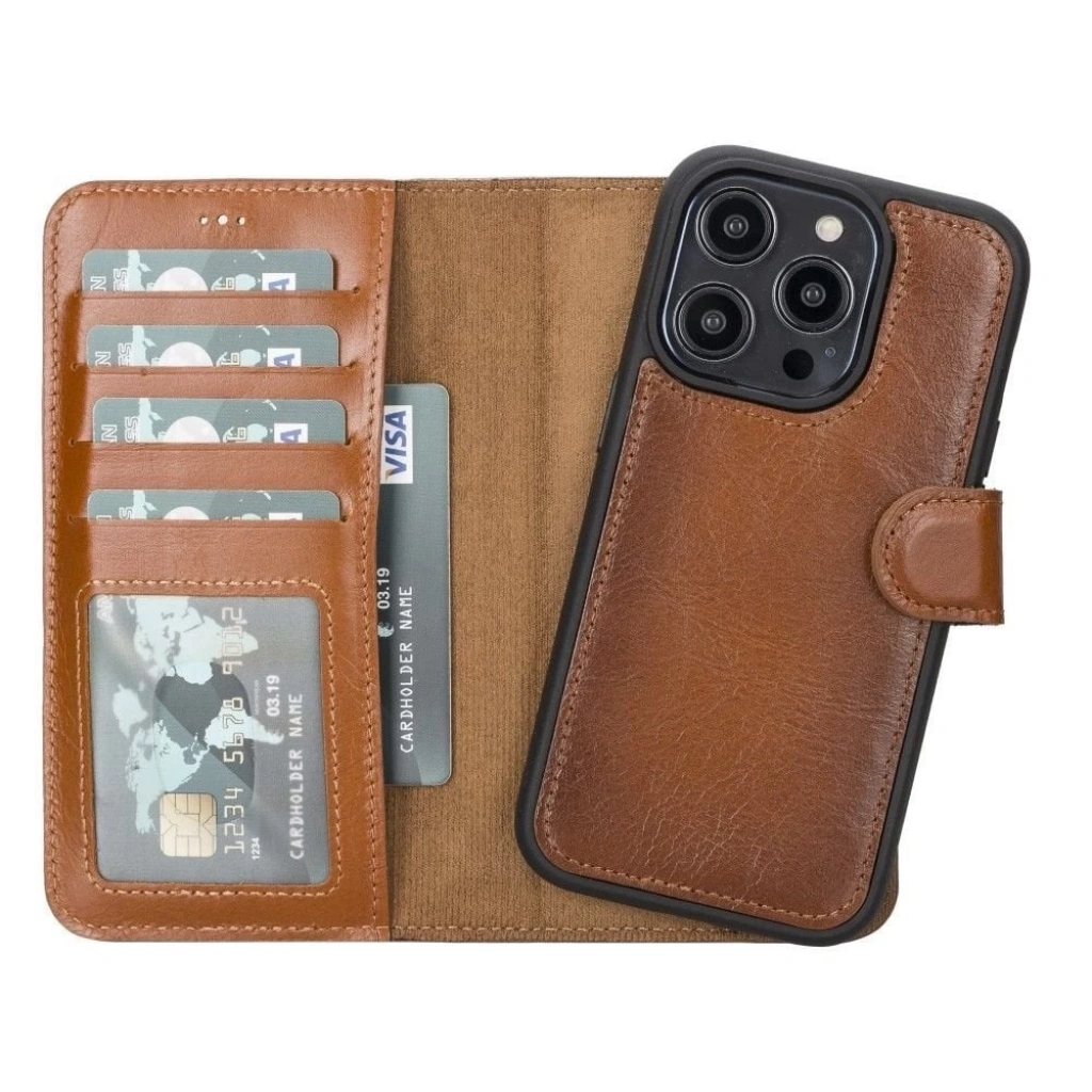 Apple iPhone 16 uyumlu, Hakiki Deri, El Yapımı, Cüzdanlı Kılıf, Karamel