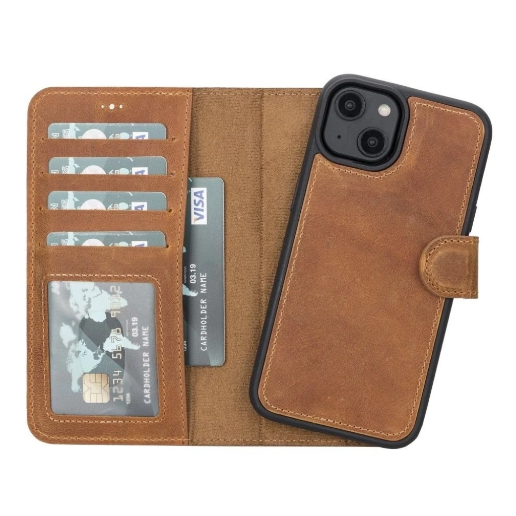 Apple iPhone 16 uyumlu, Hakiki Deri, El Yapımı, Cüzdanlı Kılıf, Karamel