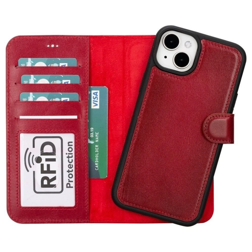 Apple iPhone 15 Plus Uyumlu Deri Cüzdanlı Kılıf MWWN V4EF Kırmızı