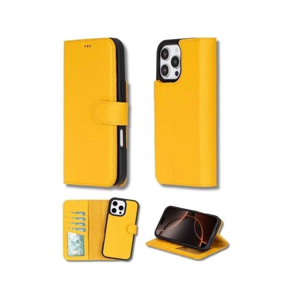 Apple iPhone 16 Pro uyumlu, Hakiki Deri, El Yapımı, Cüzdanlı Kılıf, Limon Sarı