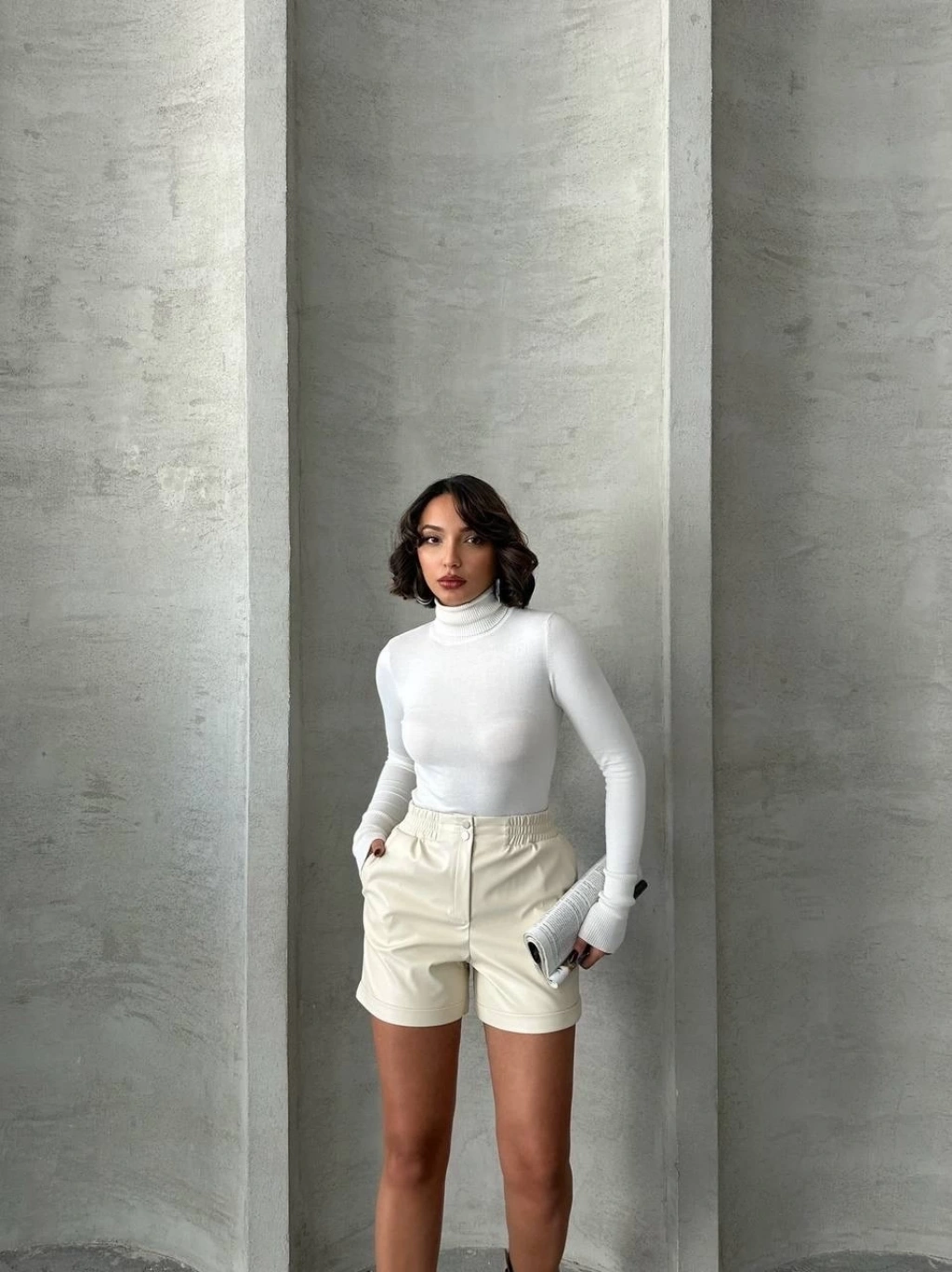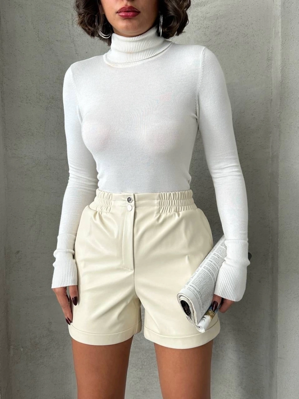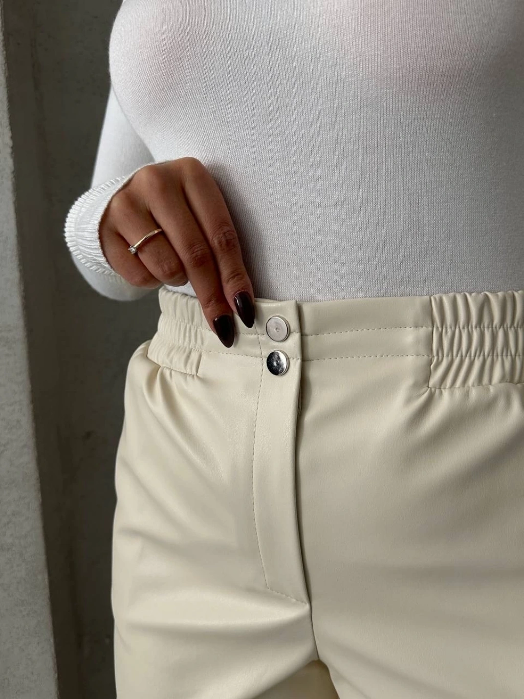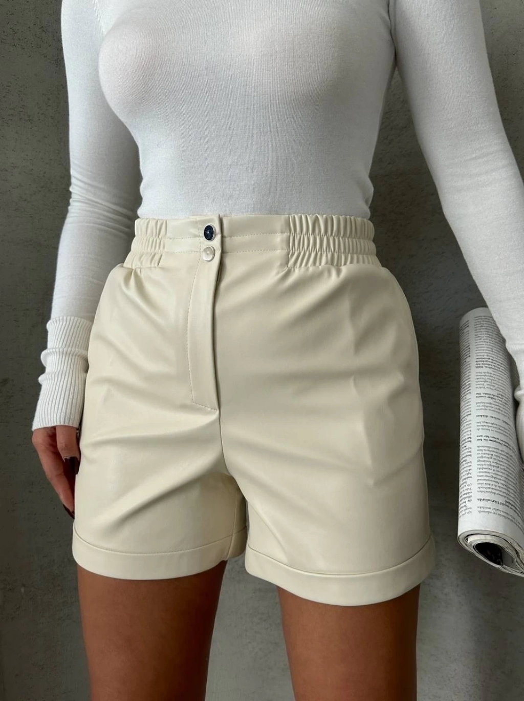 Beli lastikli çıtçıtlı deri şort krem w241007