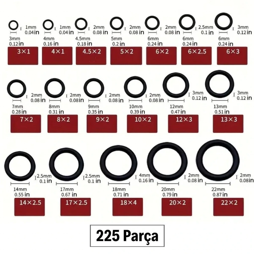 225 Parça İçerik: Farklı boyut ve şekillerde 225 adet kauçuk conta ile çeşitli uygulamalar için yeterli seçenek sunar.