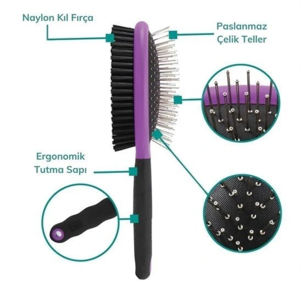 Pet fırçasının kullanabileceğiniz iki tarafı bulunur. İster dişli tarafı ile detaylı br şekilde tarayın, isterseniz de fırça tarafı ile yalnızca üstünden geçin. Bakımına tamamen siz karar verin.