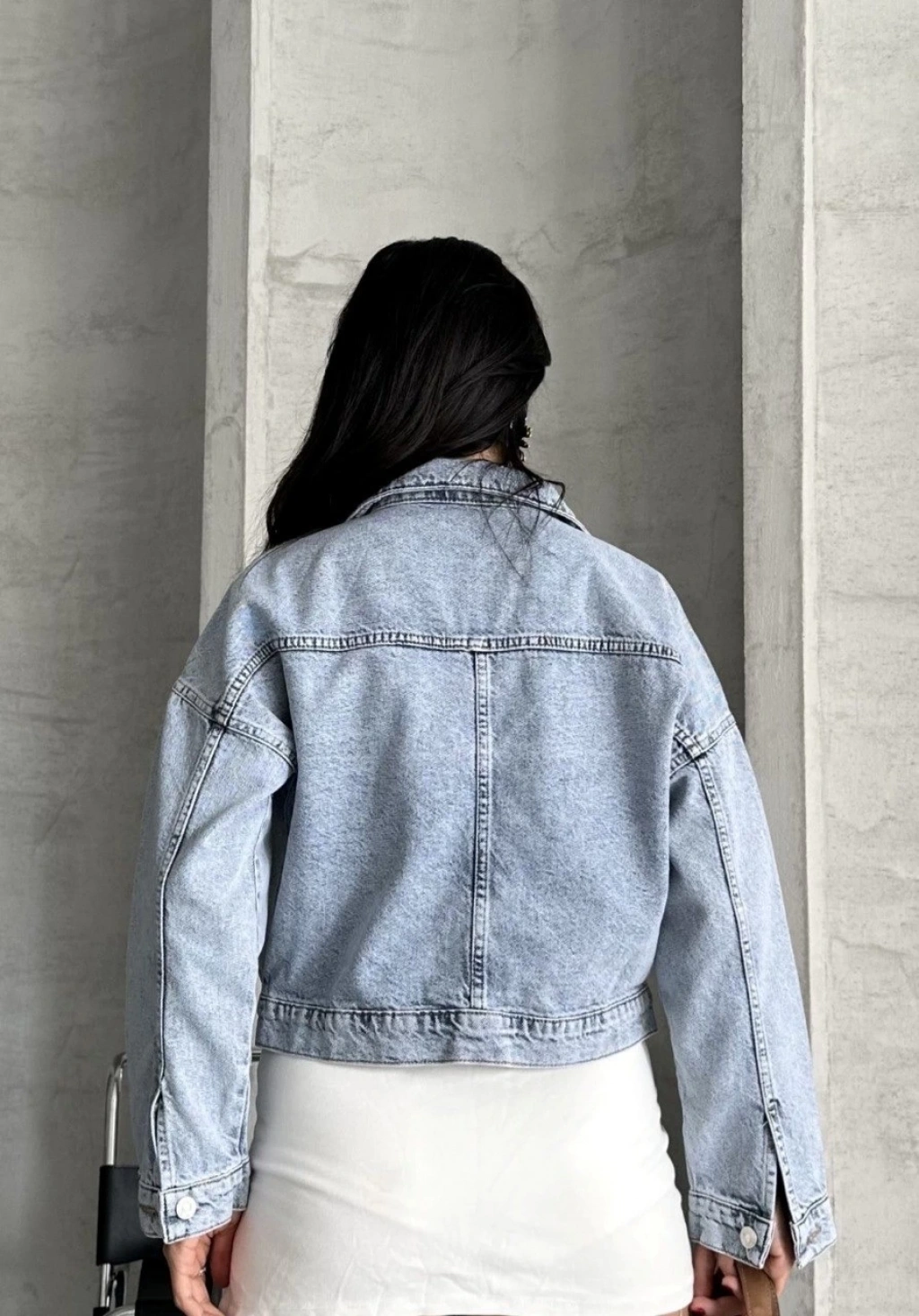 Çift cepli kol katlamalı kar yıkama crop kot ceket buz mavi d2000