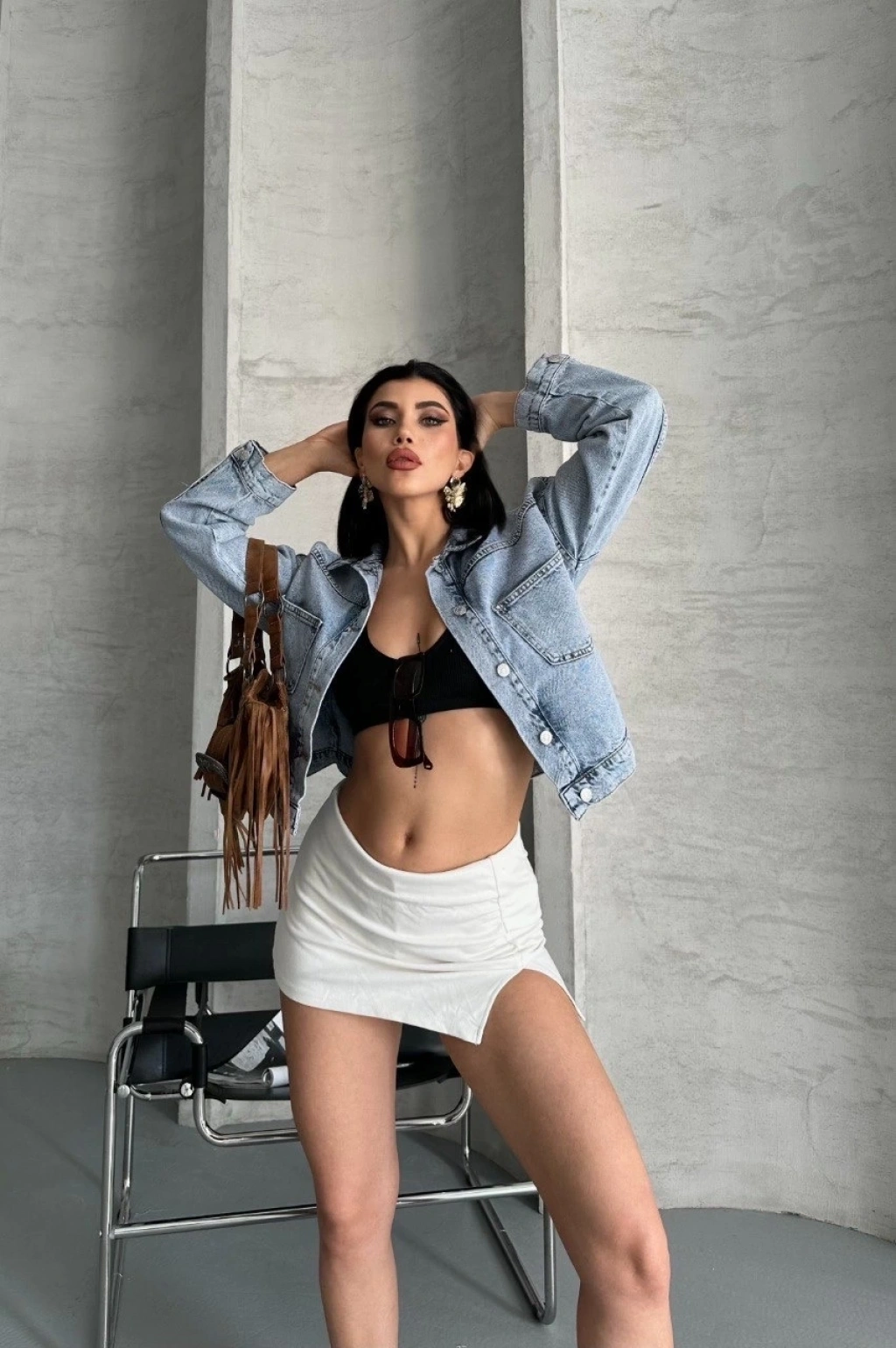 Çift cepli kol katlamalı kar yıkama crop kot ceket buz mavi d2000