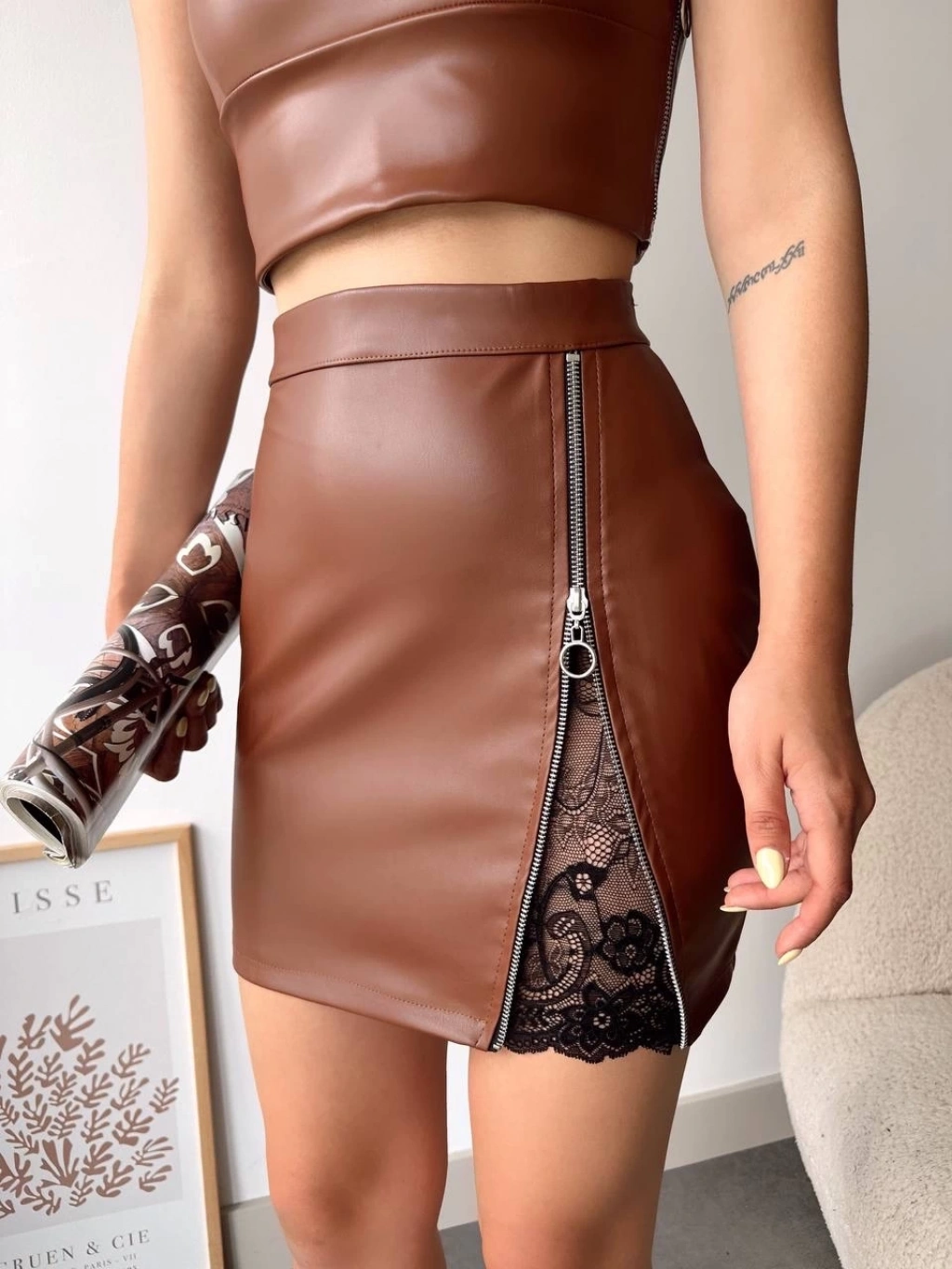 Cep detaylı oval kapaklı deri etek kahve h240048