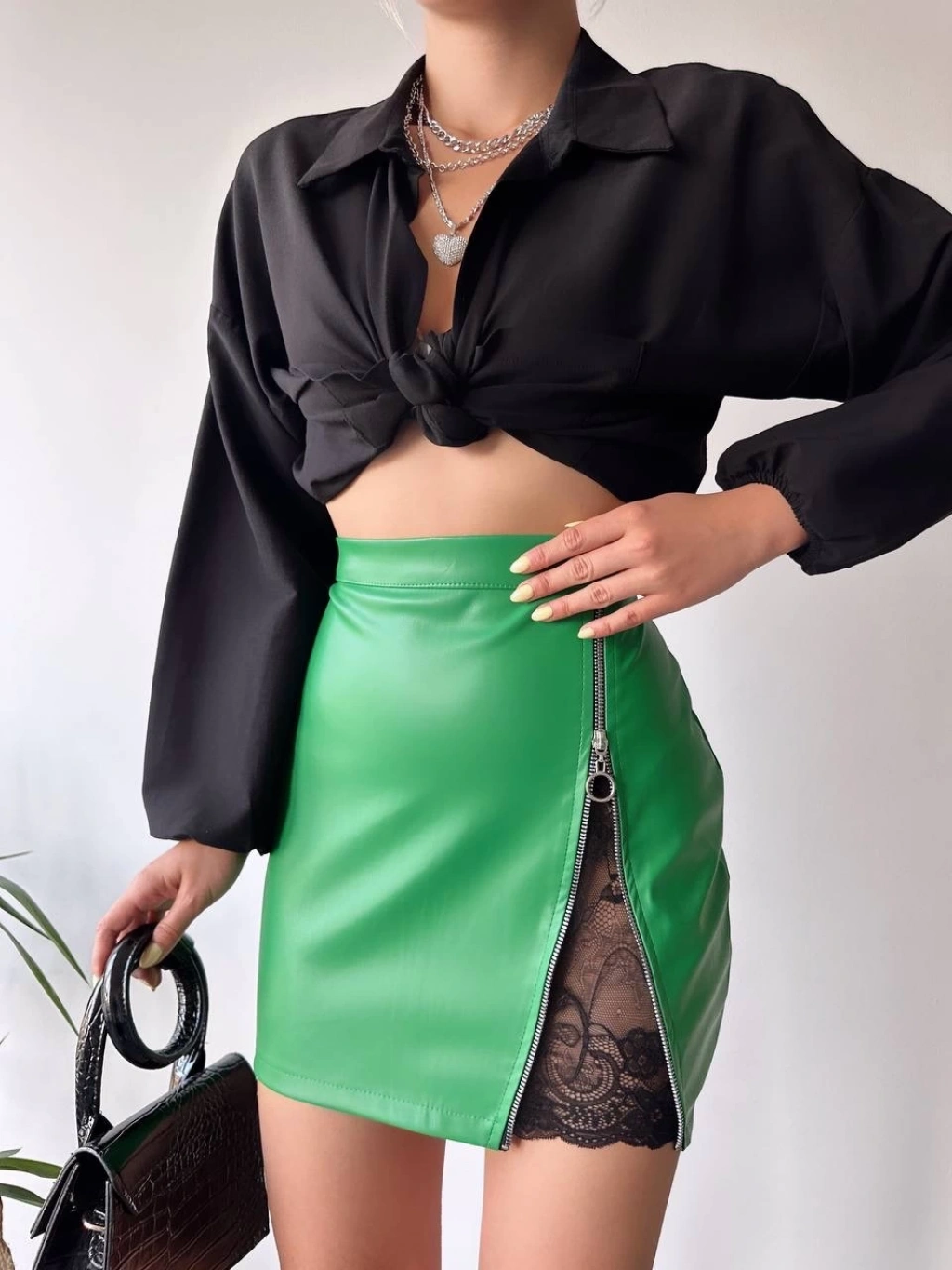 Cep detaylı oval kapaklı deri etek yeşil h240048