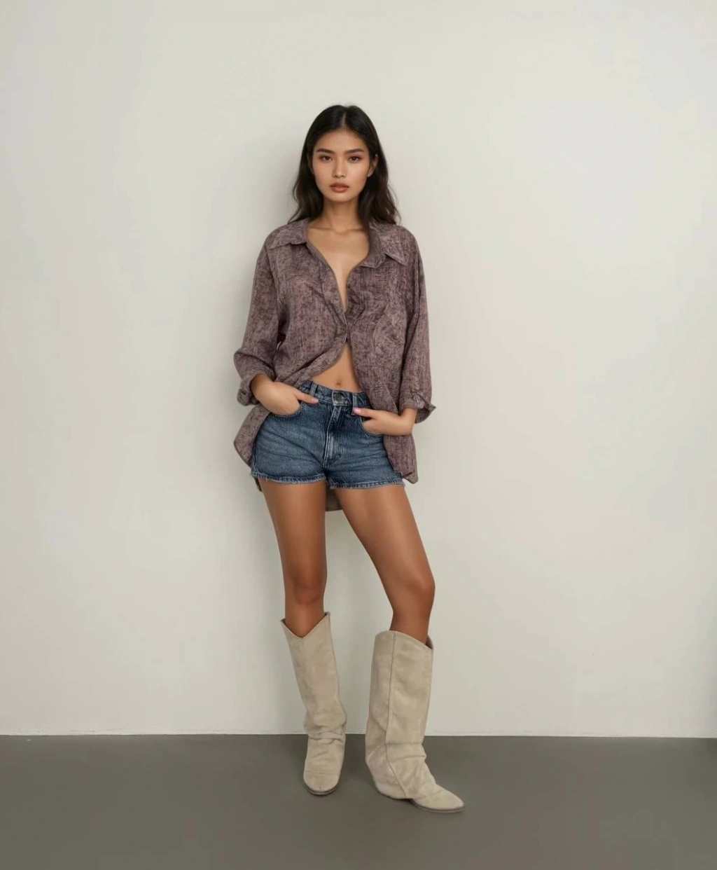 Uzun kaşe gömlek beyazkremit st255812