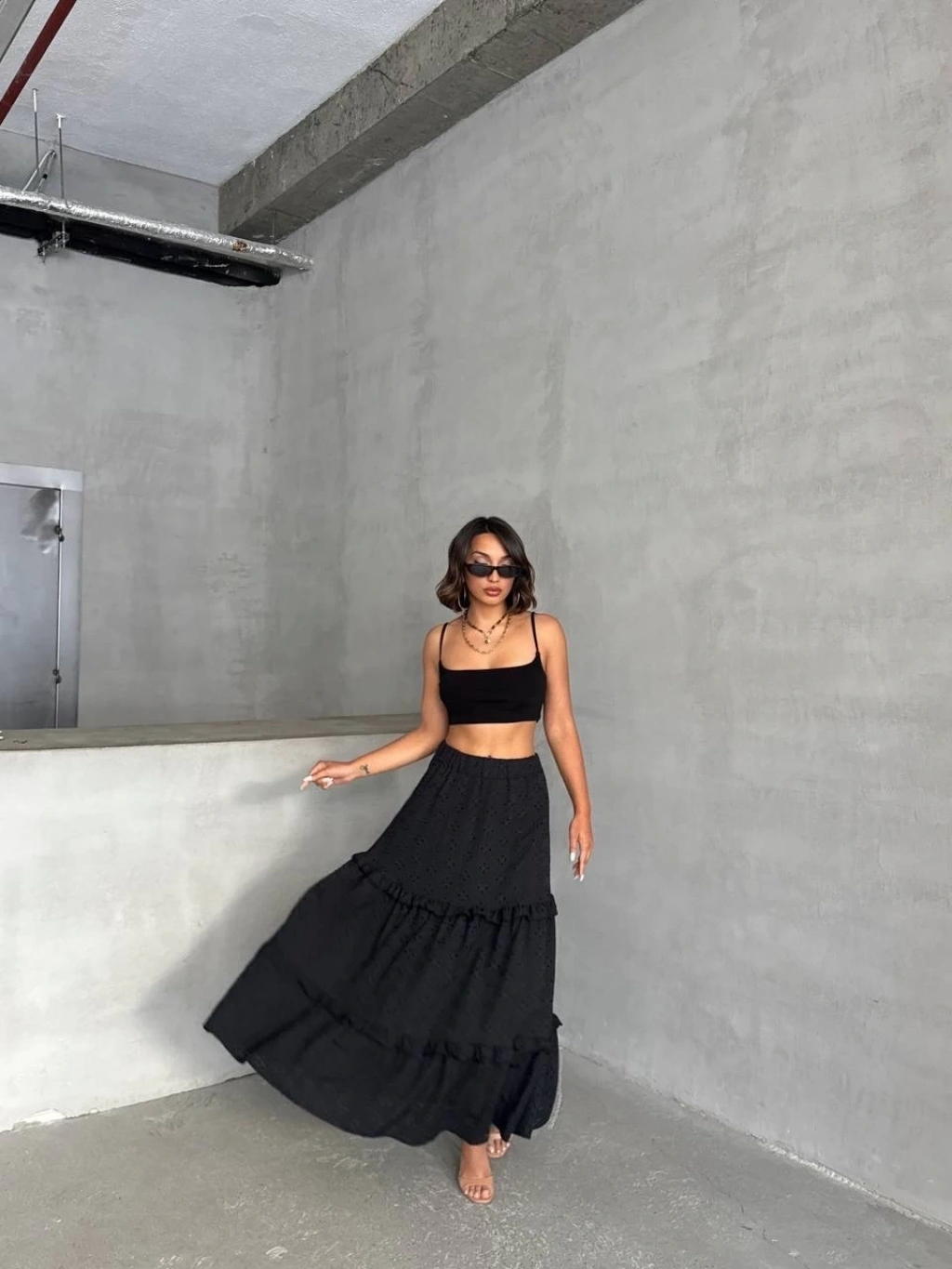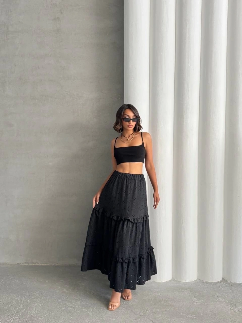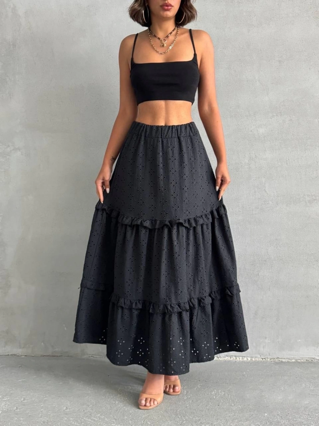 Fırfırlı brodeli astarlı uzun etek siyah s255047
