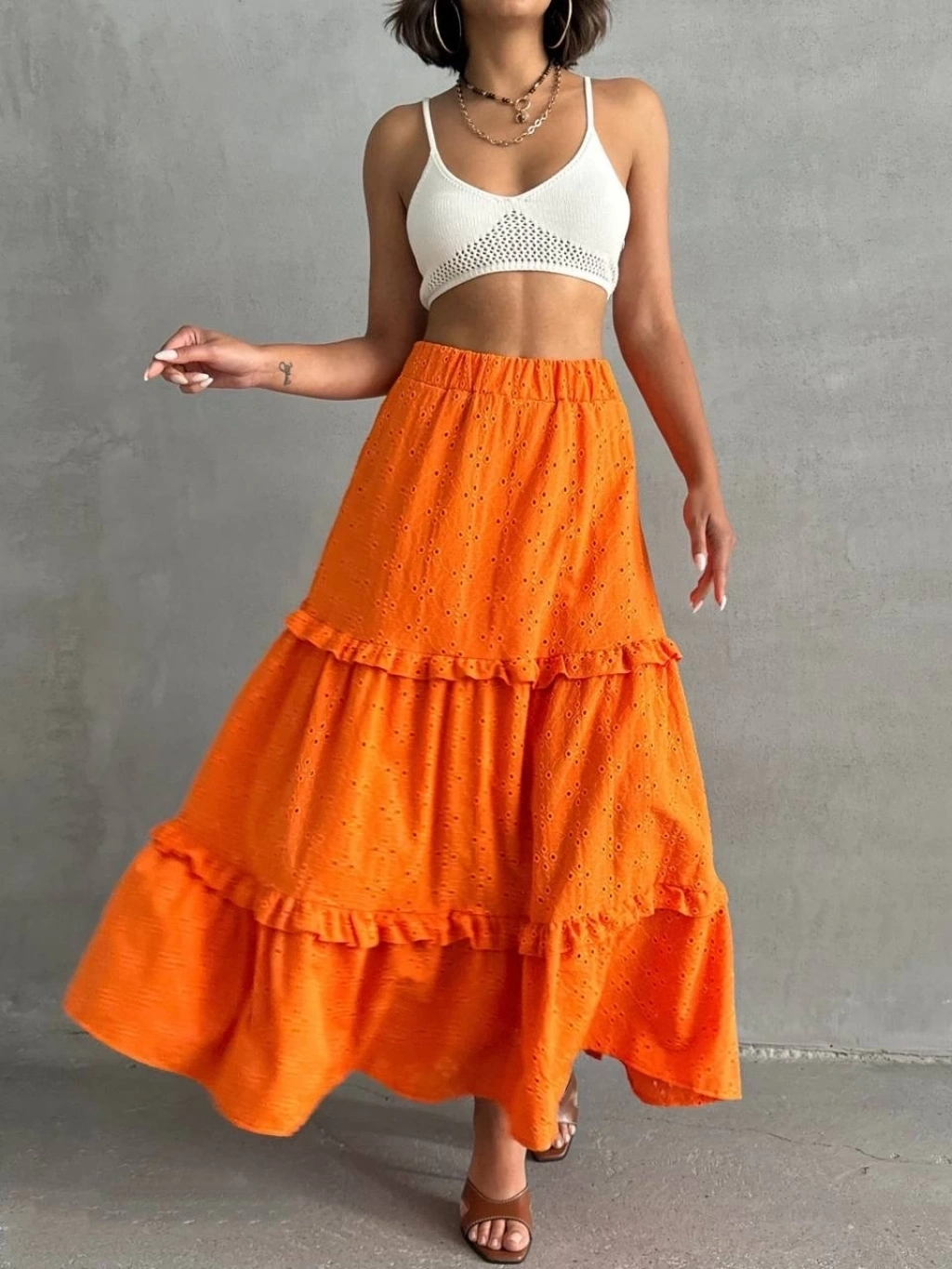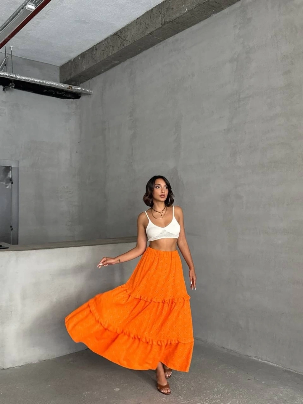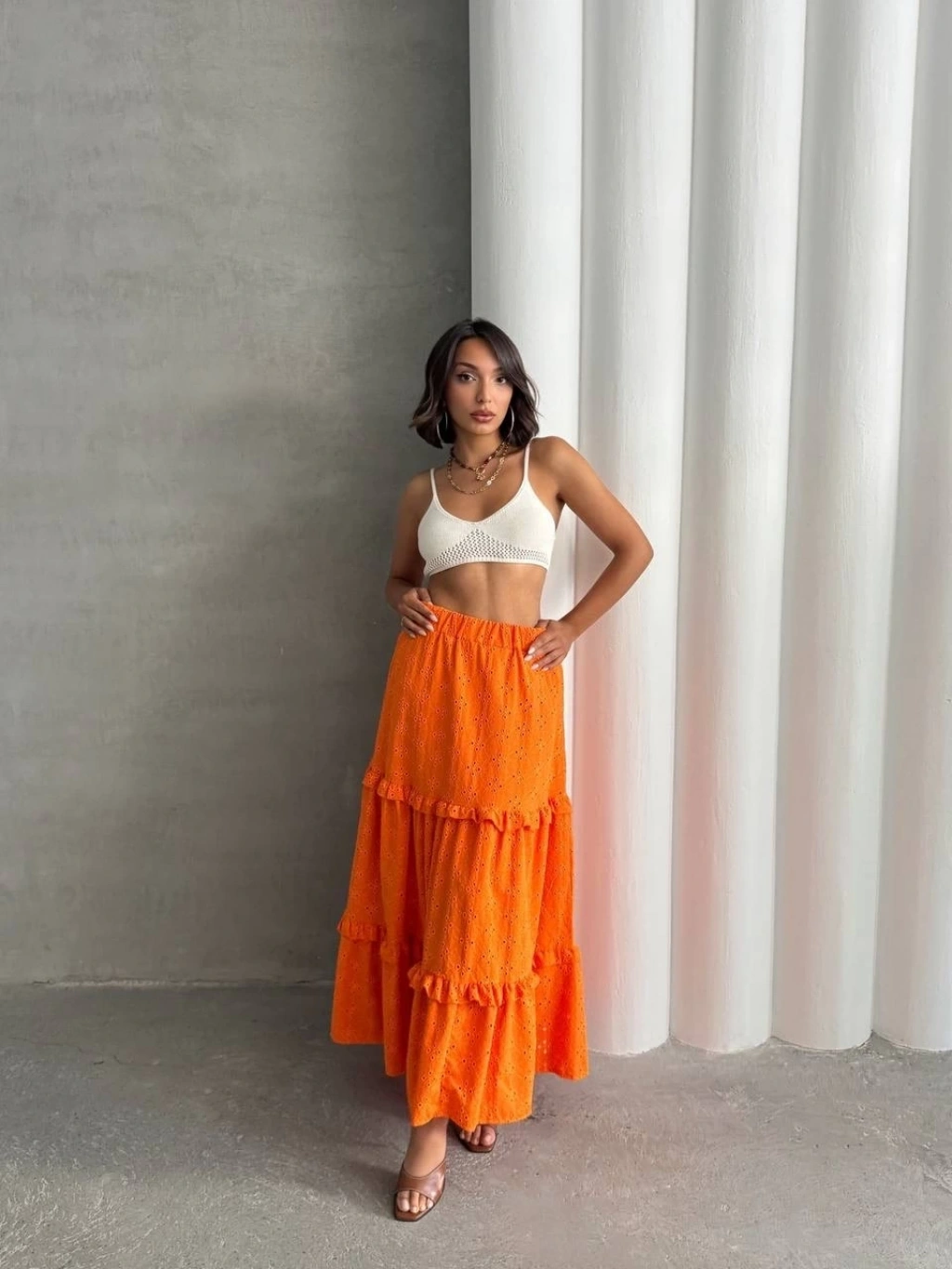 Fırfırlı brodeli astarlı uzun etek turuncu s255047