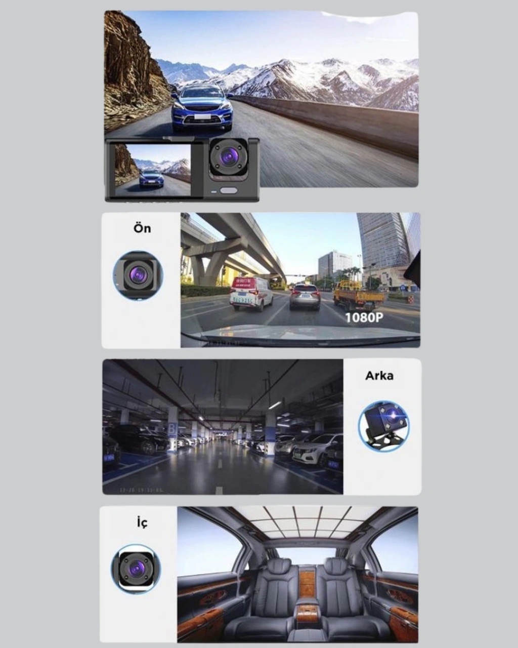 Full HD Üç Kameralı Araç Kamerası 170° Geniş Açılı ve Park Destekli