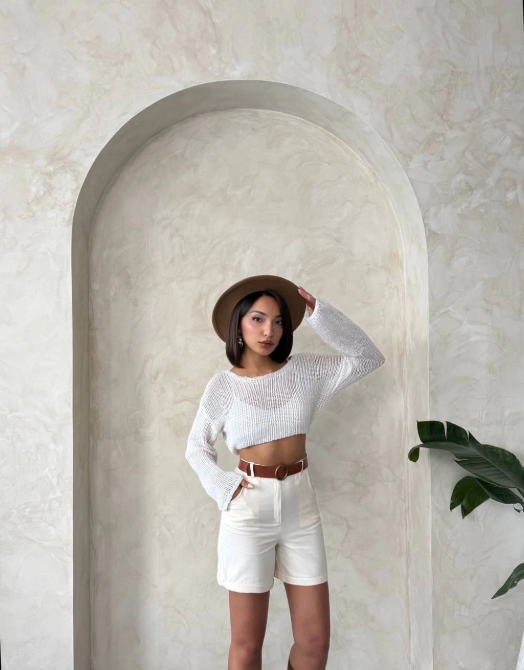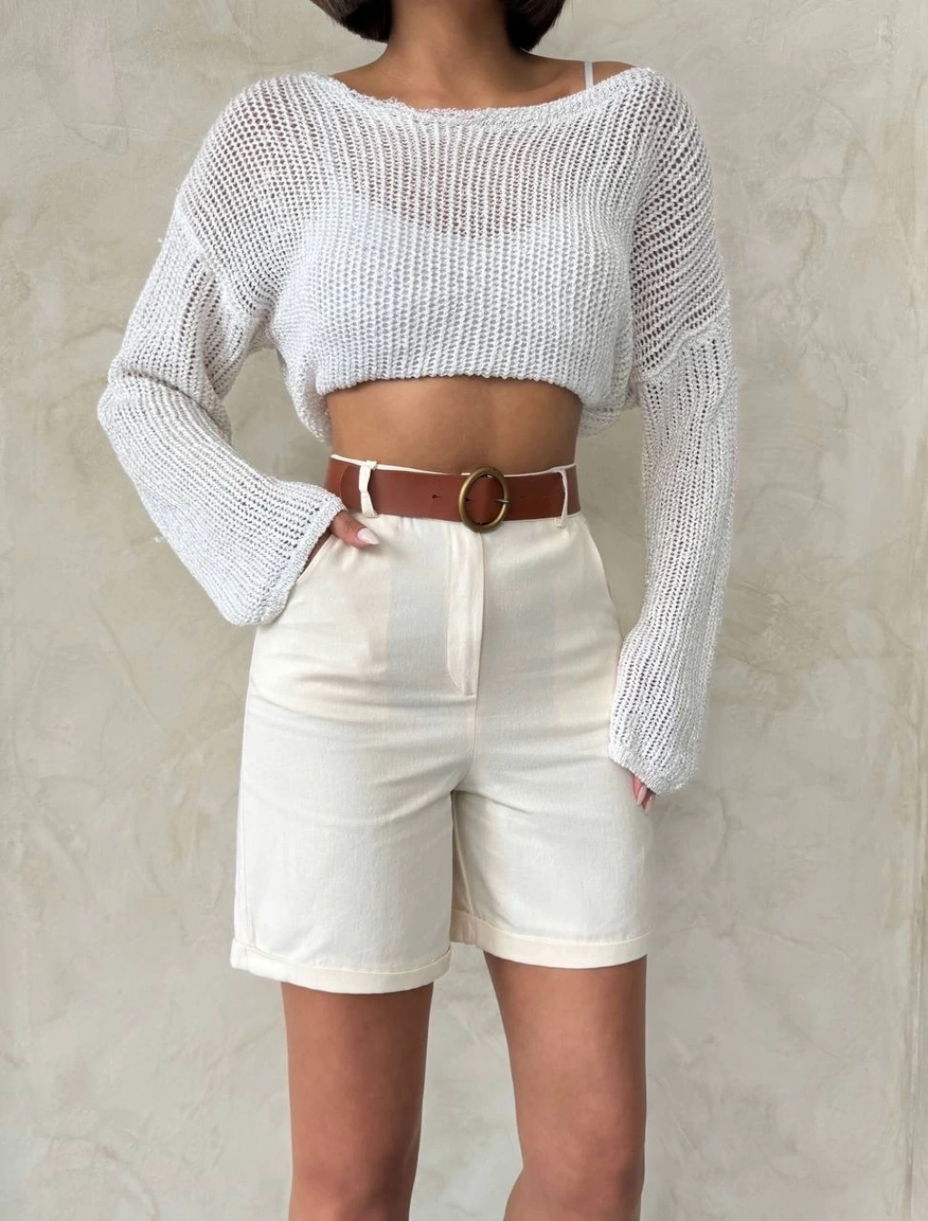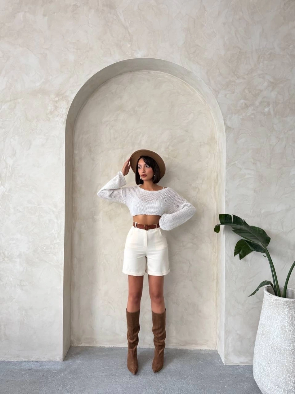 İki düğmeli kaz ayağı desen ch kumaş şort etek beyazturuncu h26414
