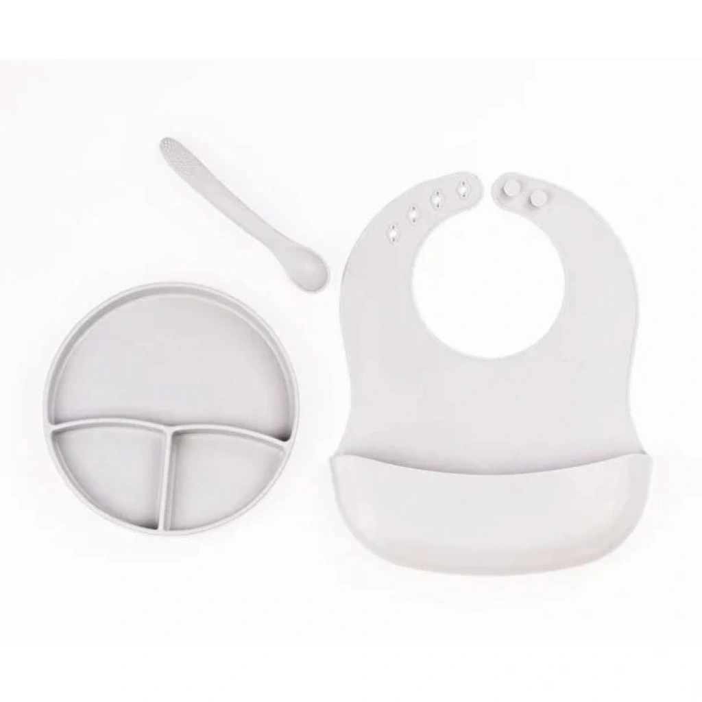 Gri 3’lü Silikon Yemek Seti – Önlük + Diş Kaşıyıcılı Kaşık + Vakumlu Tabak