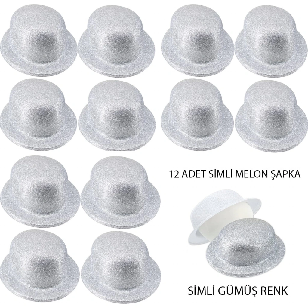 Gümüş Renk Simli Melon Yuvarlak Parti Şapkası 12 Adet