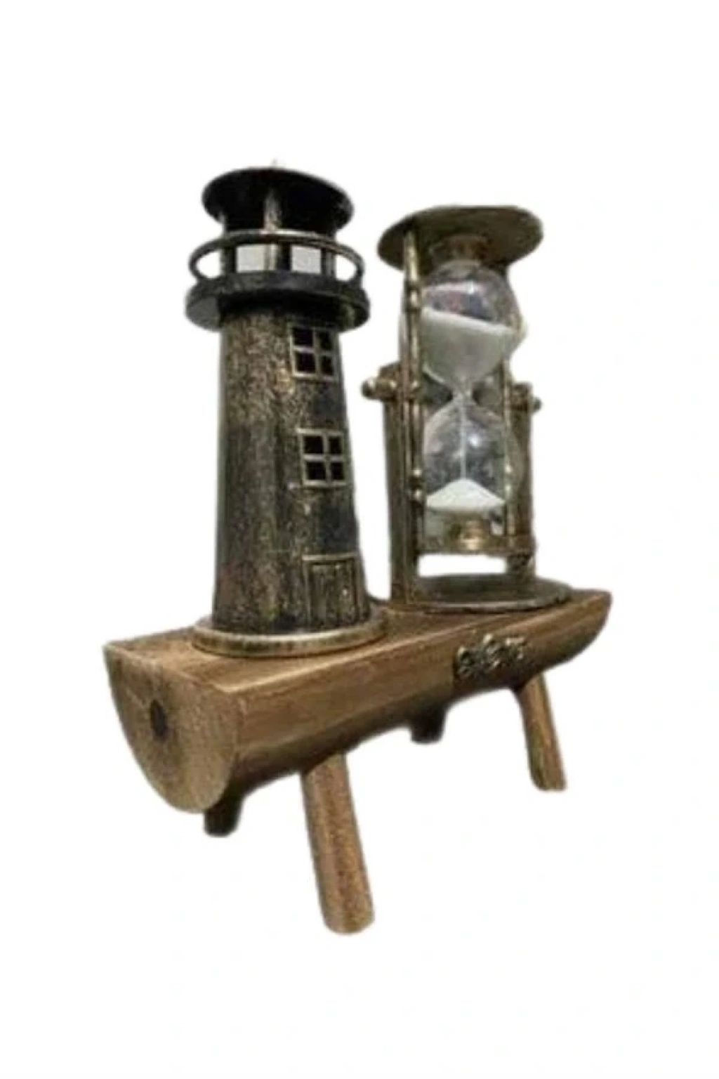Dekoratif Ahşap Kum Saati ve Deniz Feneri Figürlü Masa Süsü – Şık ve Fonksiyonel Tasarım