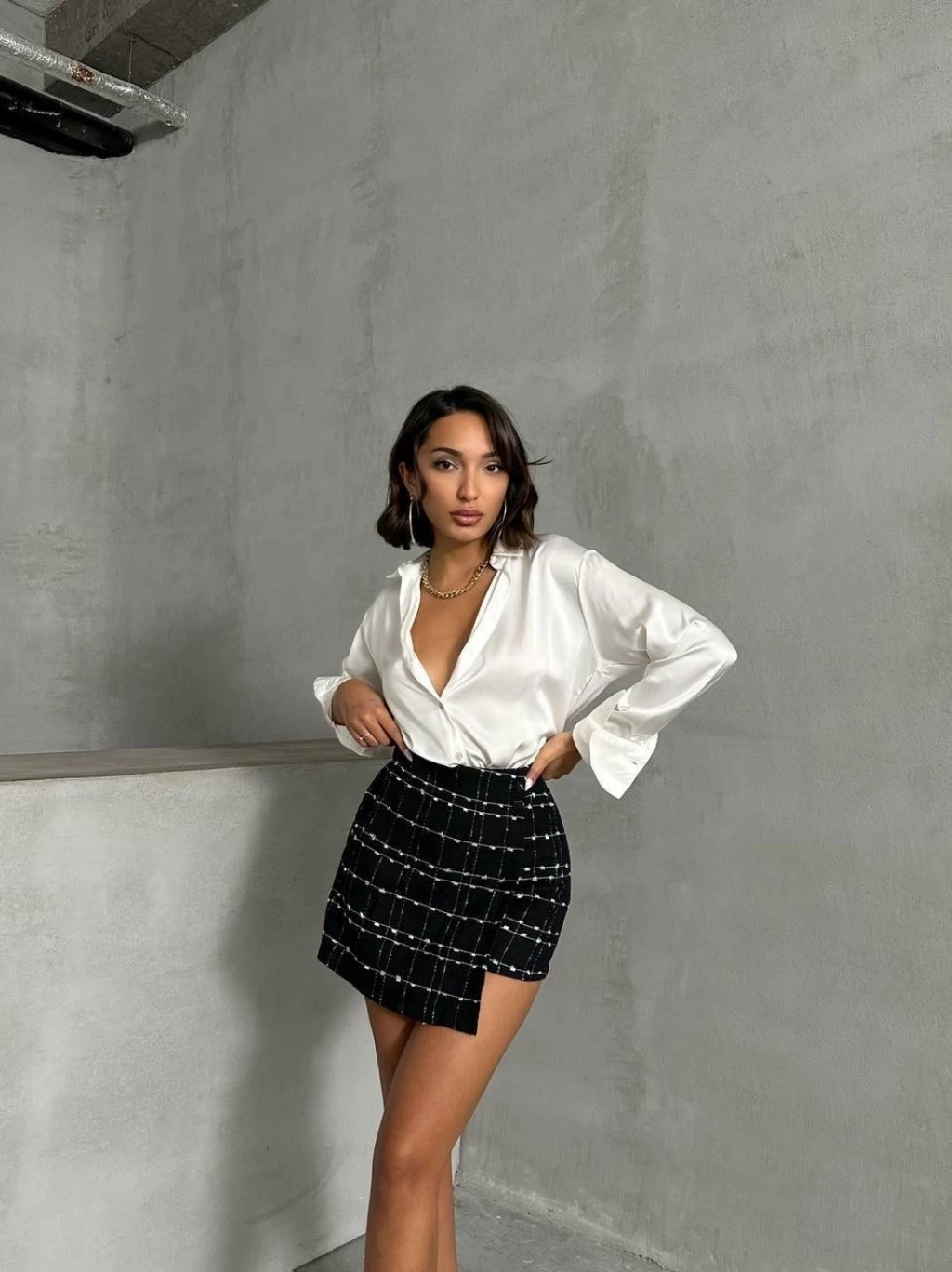 İki düğmeli şort ch kumaş etek ekoseli siyahbeyaz h26414