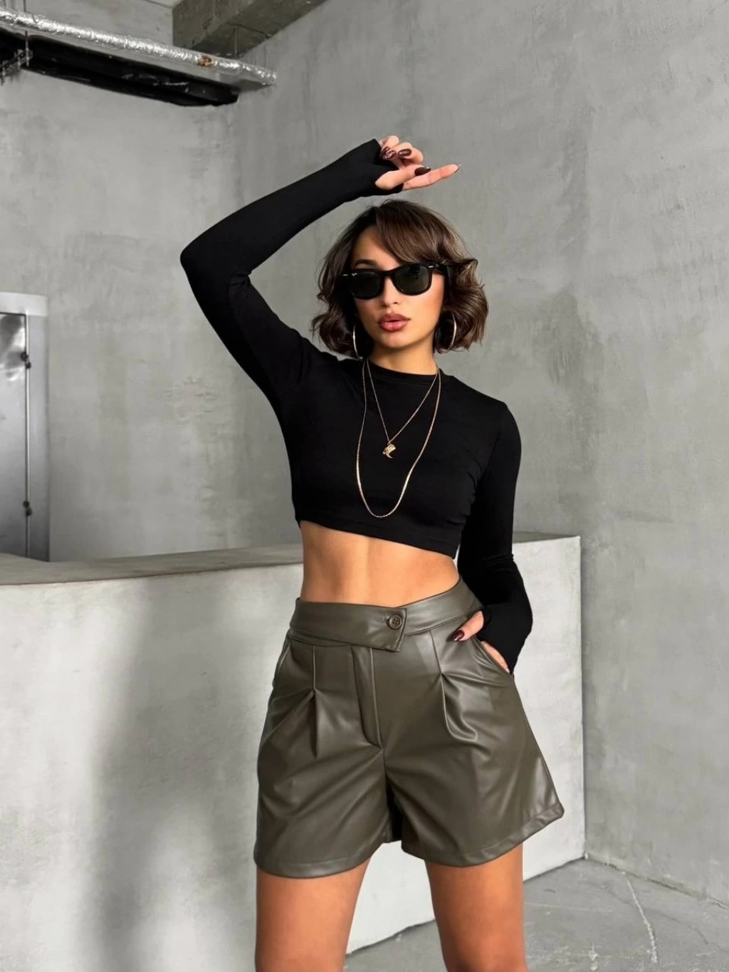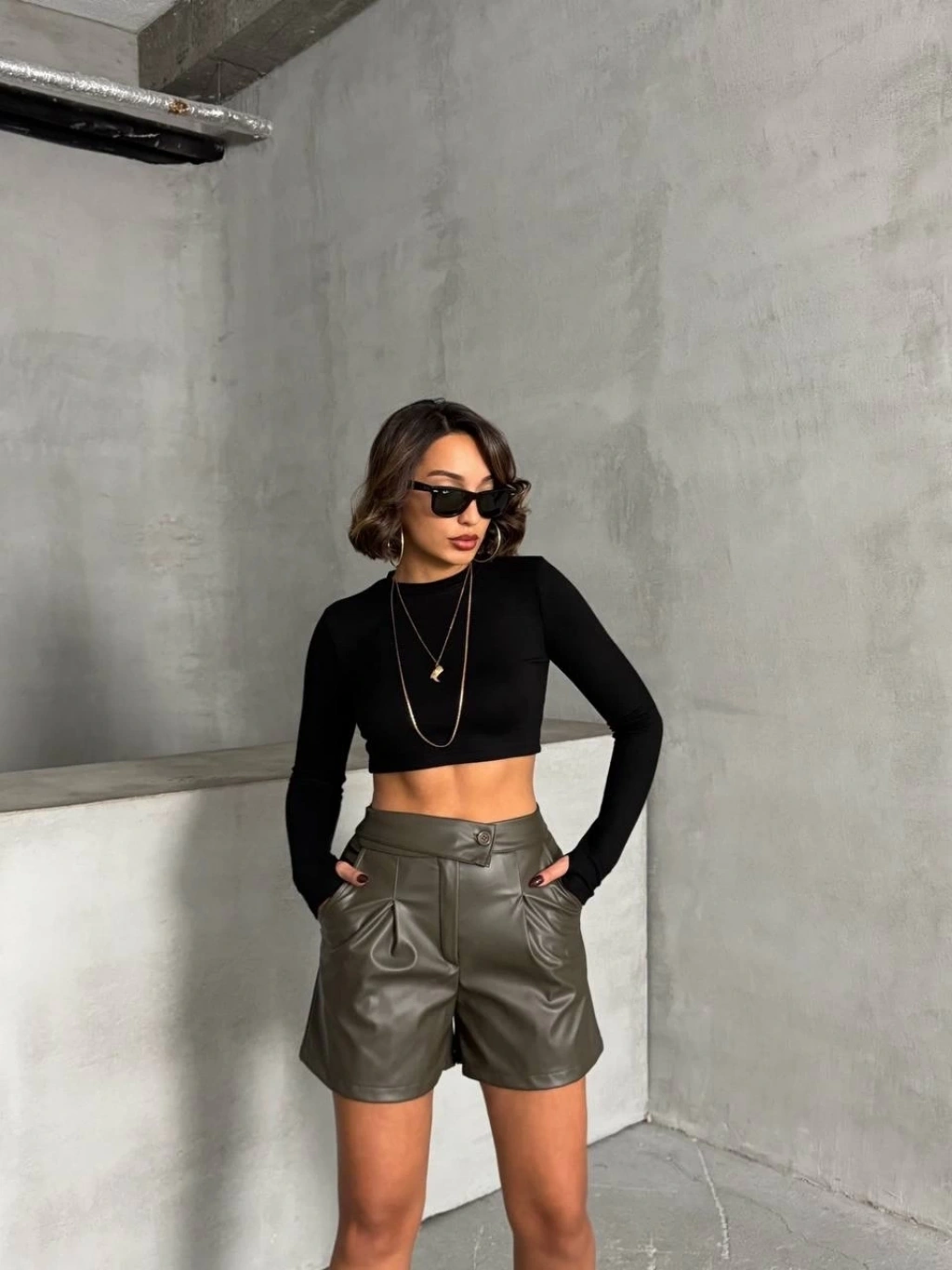 Çıtçıtlı siyah köprü tüvit şort yeşil