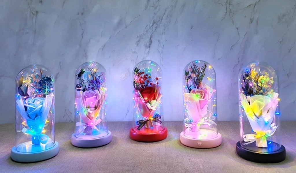 Işıklı Müzikli Cam Fanus İçinde Lavantalı Romantik Gül