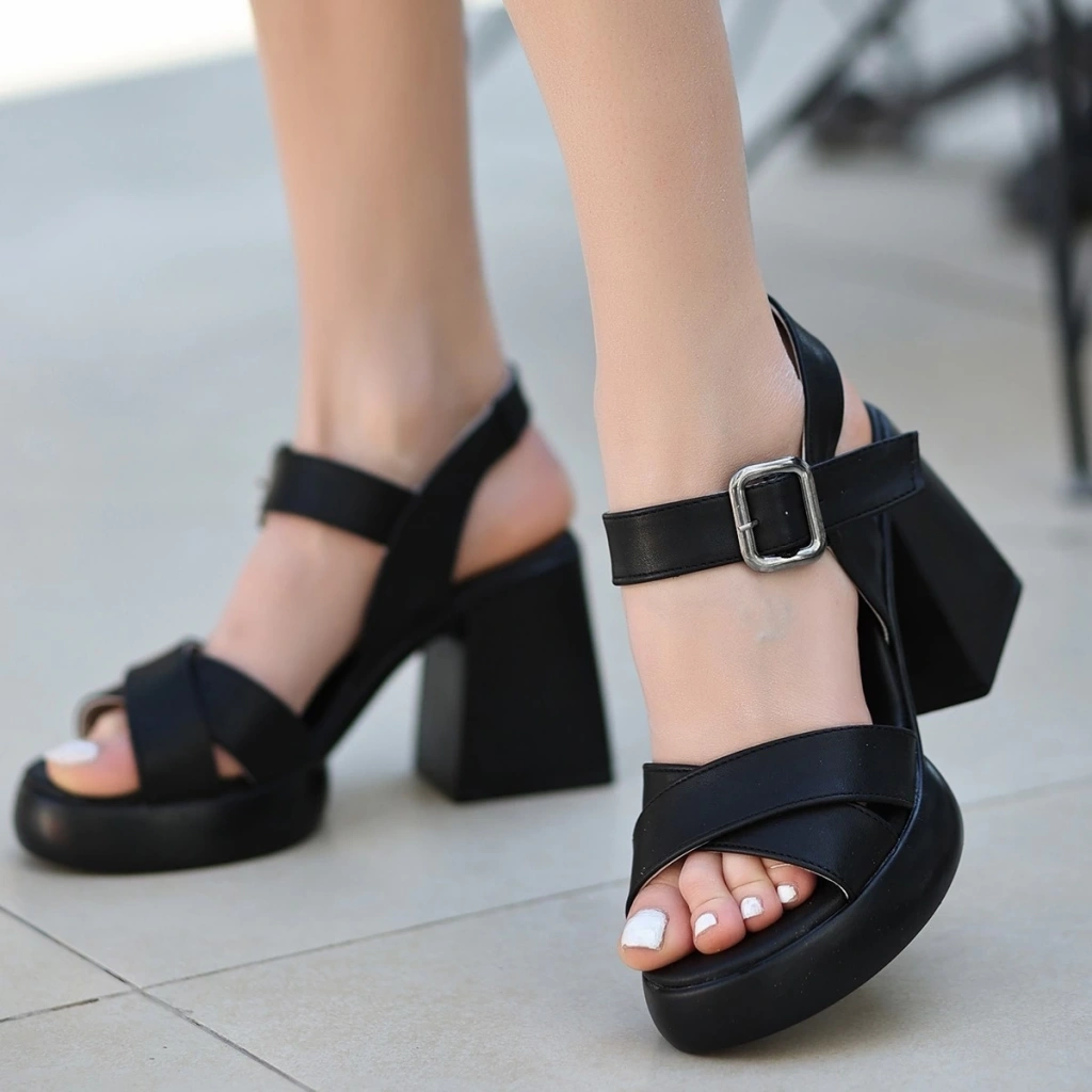 Sinna Siyah Cilt Tül Detaylı Sandalet