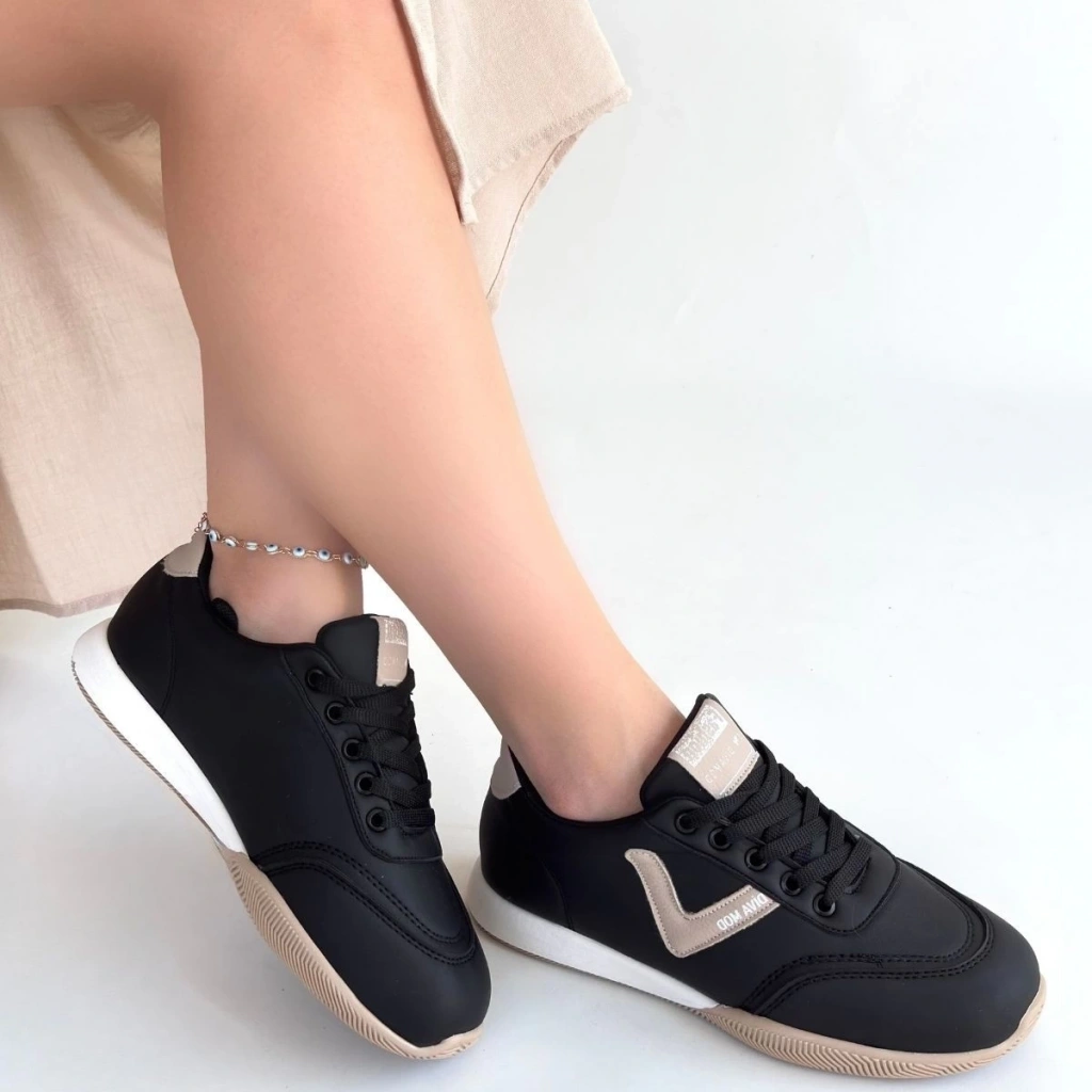 Tawen Siyah Cilt Bej Tabanlı Bağcıklı Spor Ayakkabı