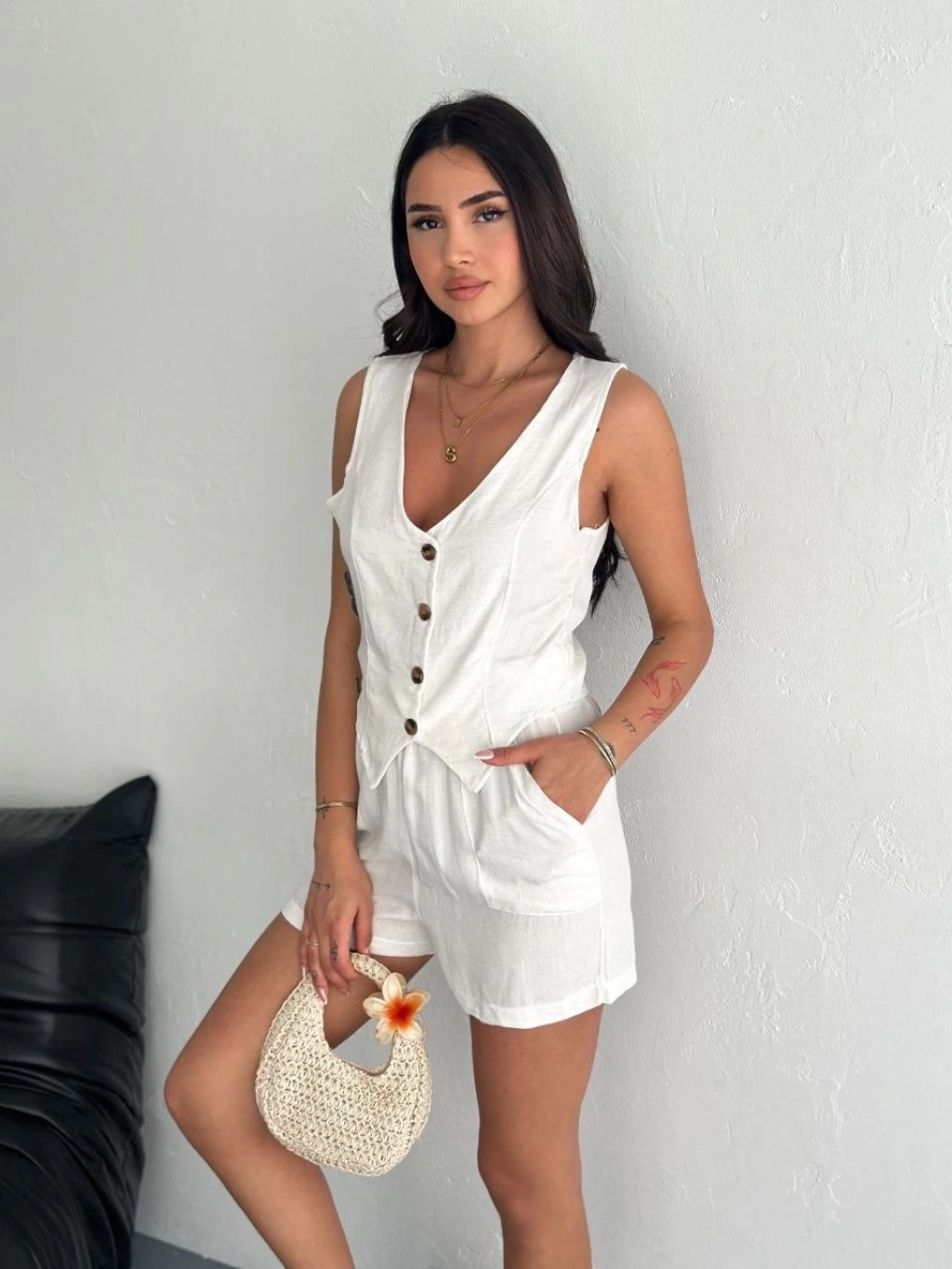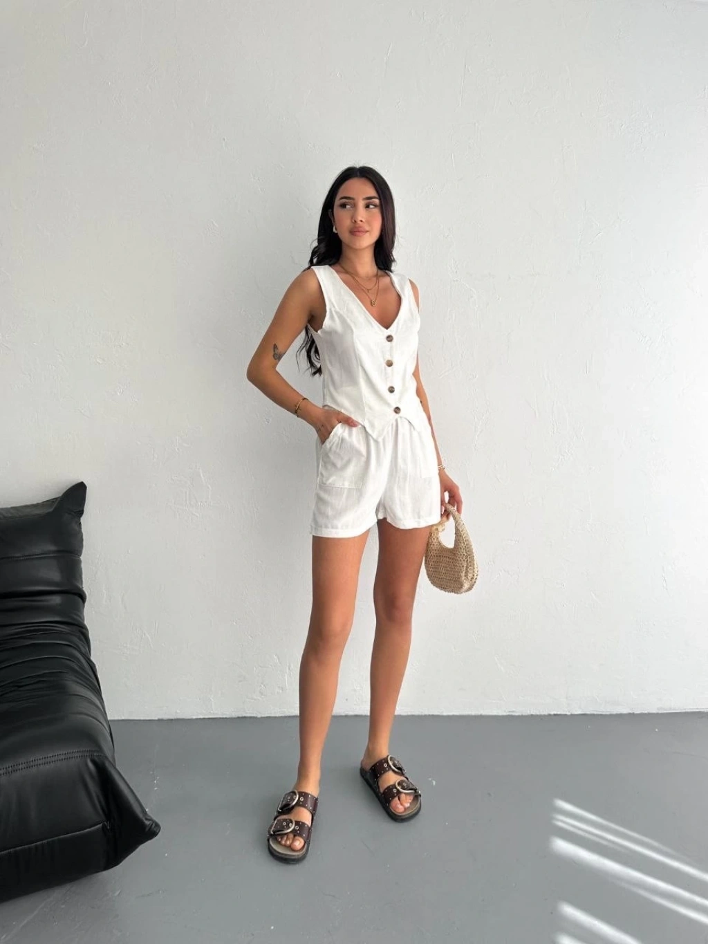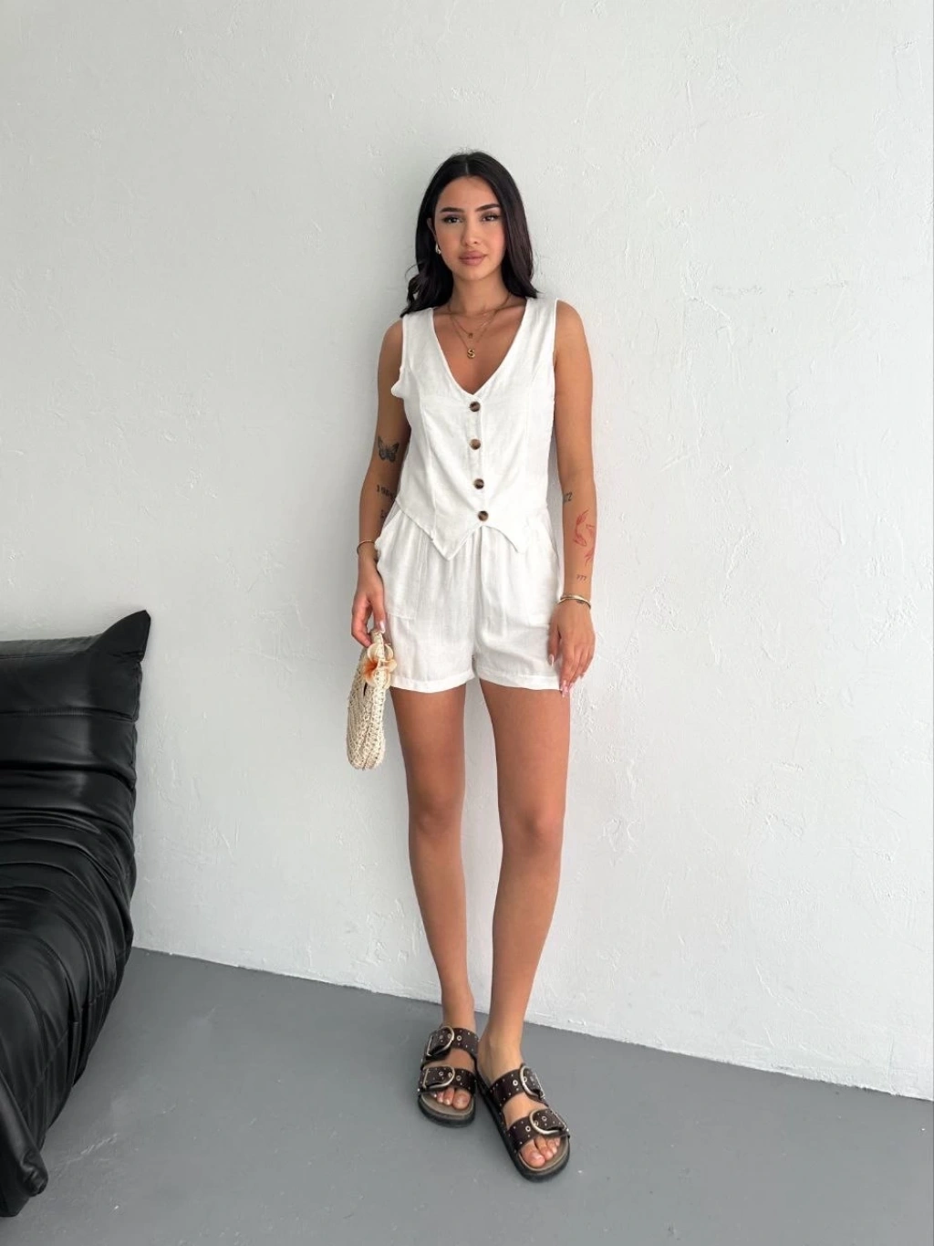 Kadın keten şort yelek takım s3461