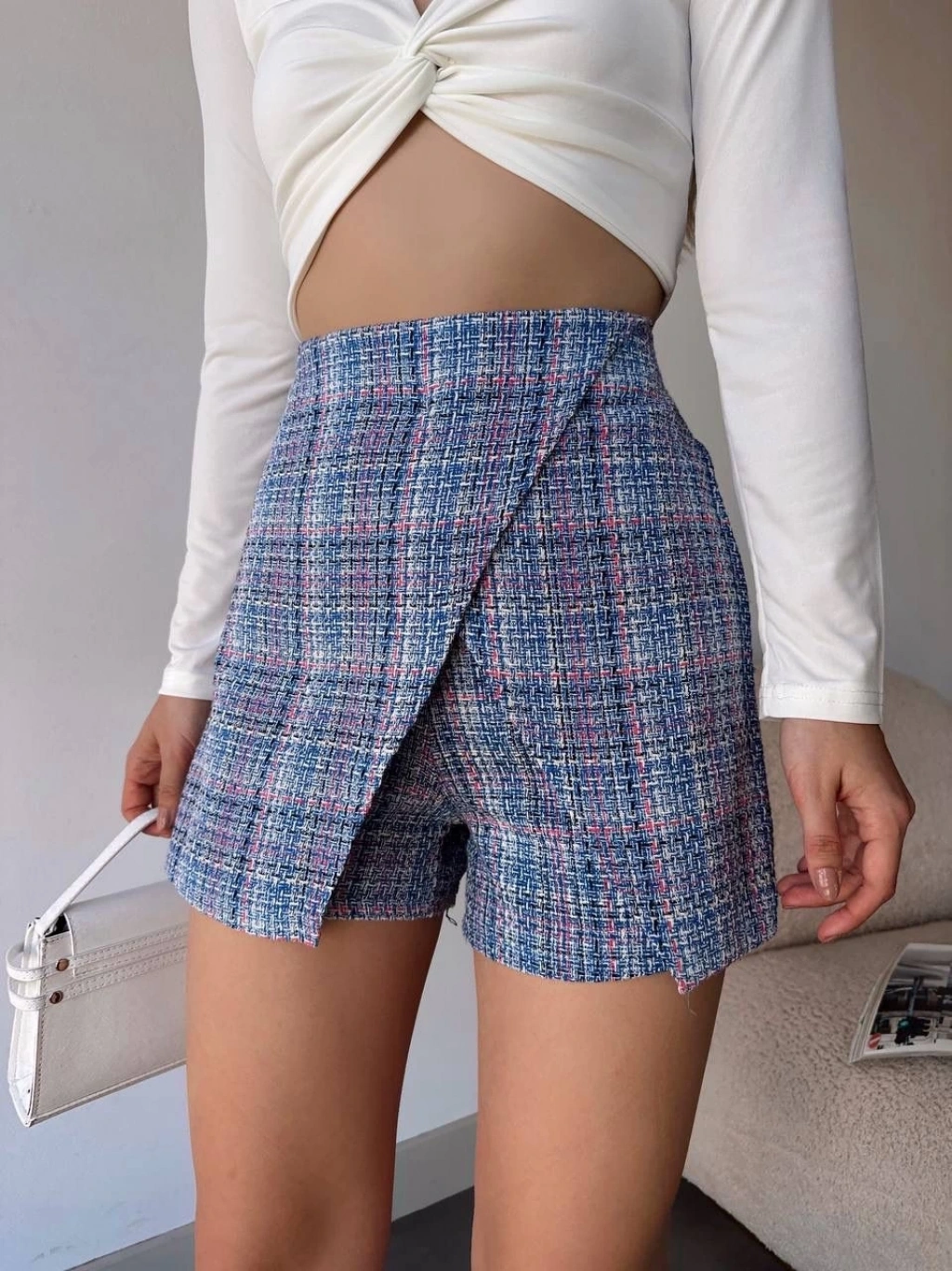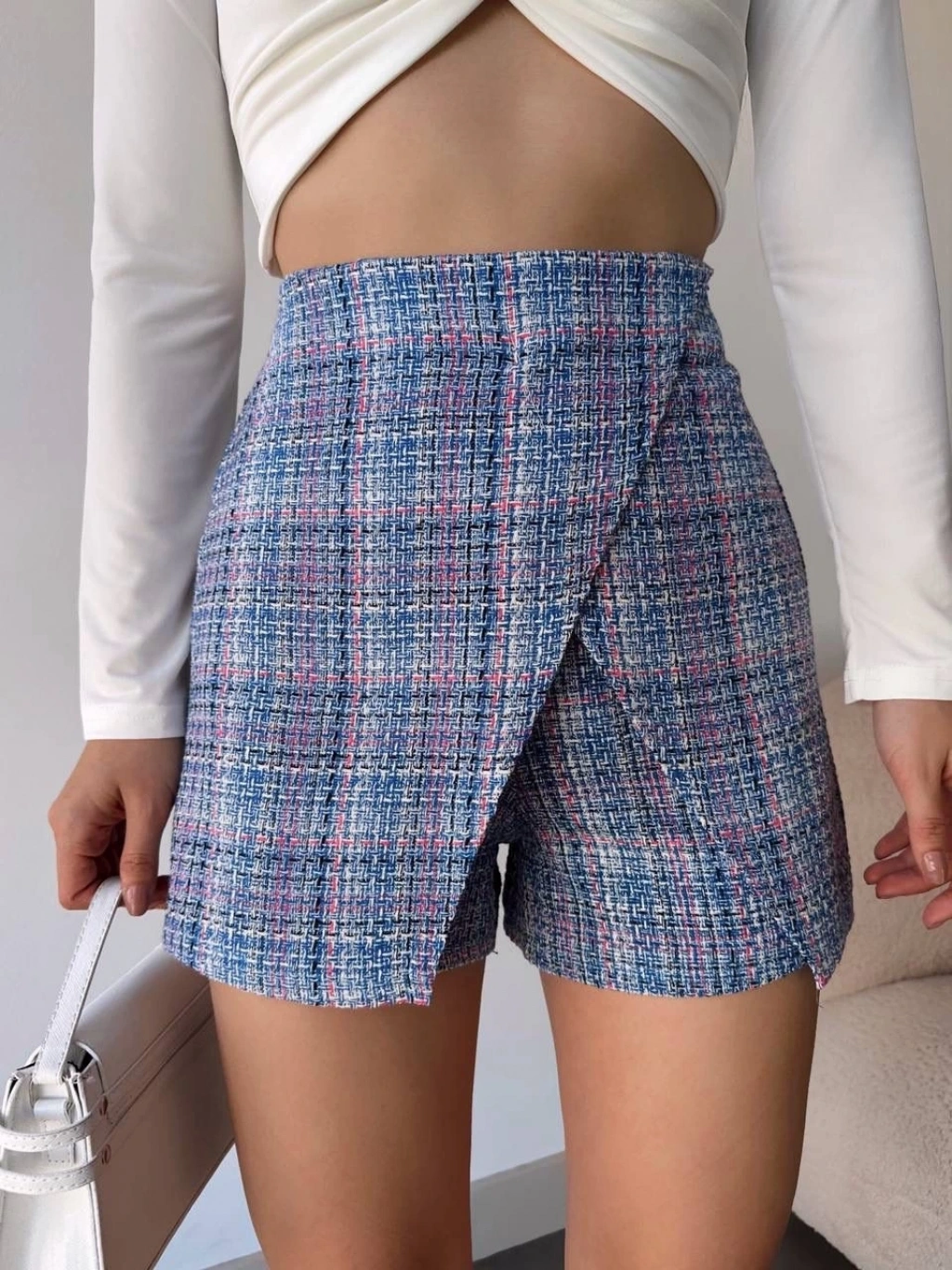 Kapaklı tüvit şort etek mavi