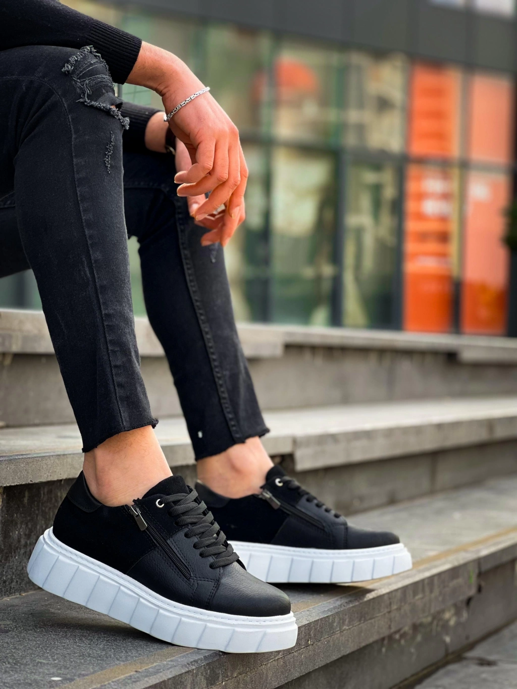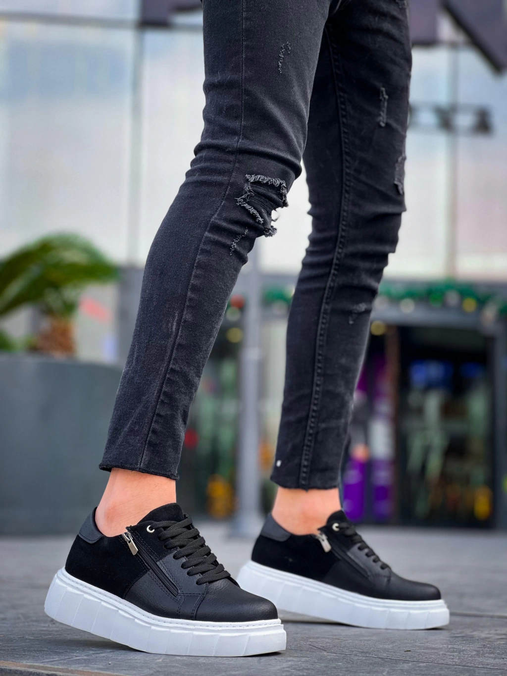 KB-X155 Kuback Siyah Cilt Siyah Süet Detaylı Beyaz Yüksek Taban Günlük Spor Ayakkabı