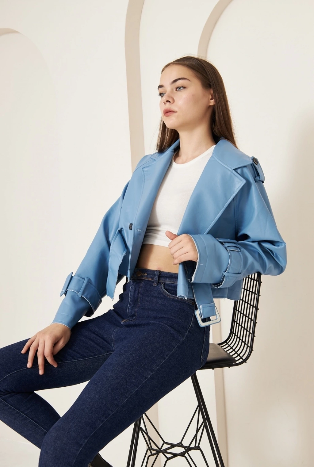 Çift cepli kol katlamalı kar yıkama crop kot ceket buz mavi d2000