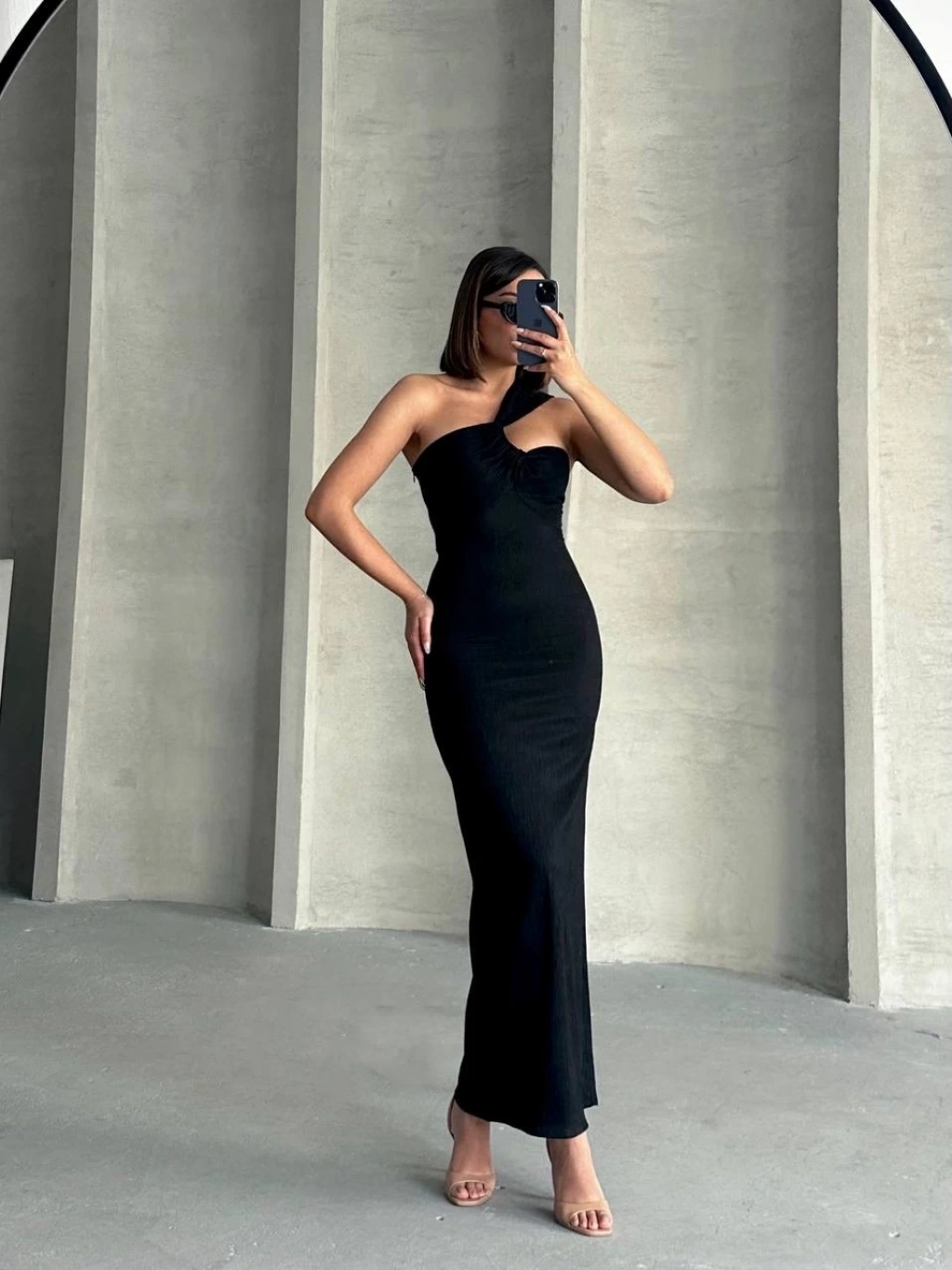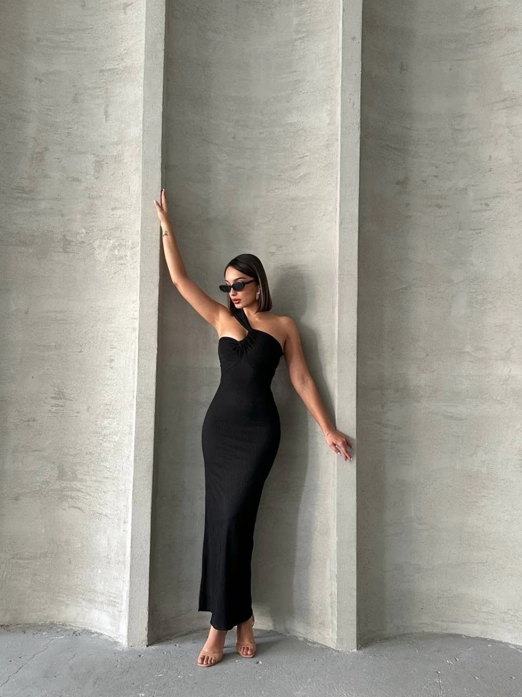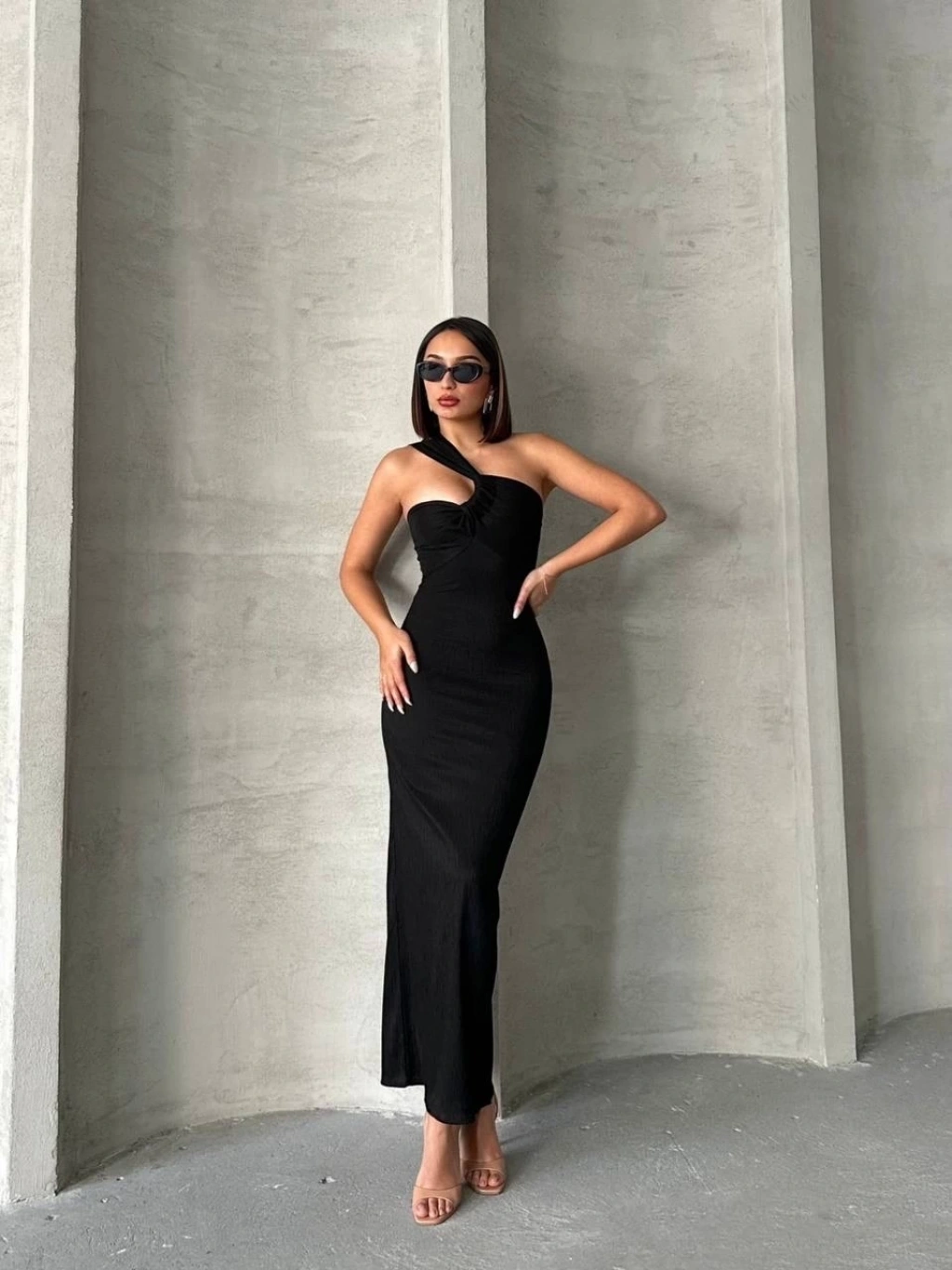 Krinkıl tek omuz uzun elbise siyah s25455