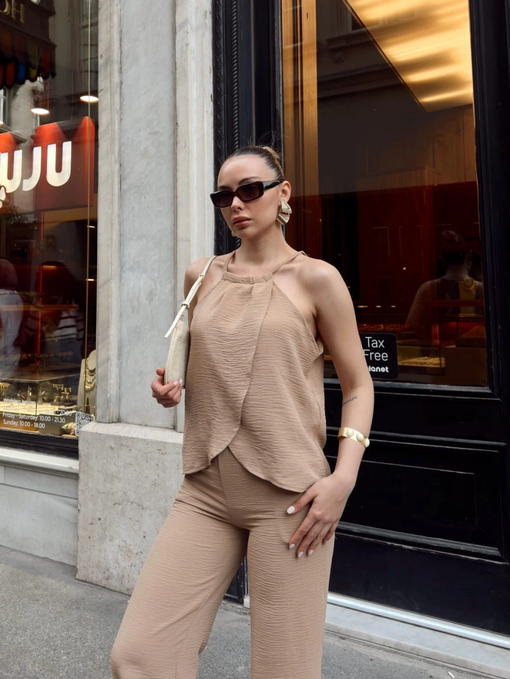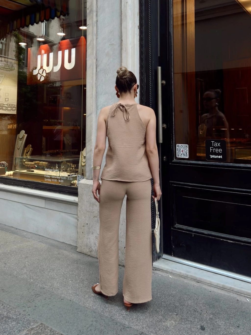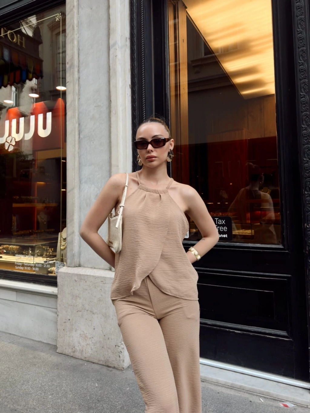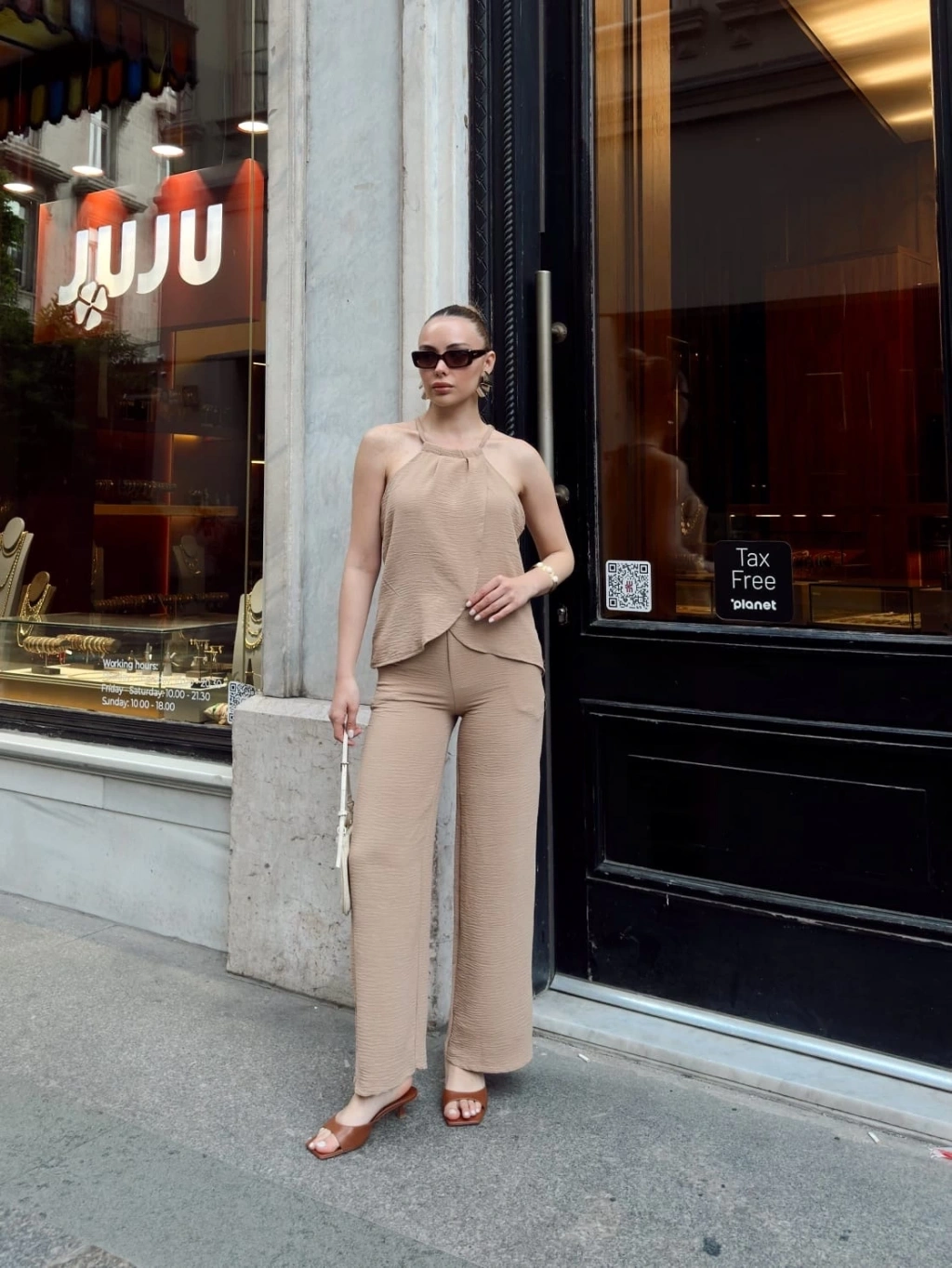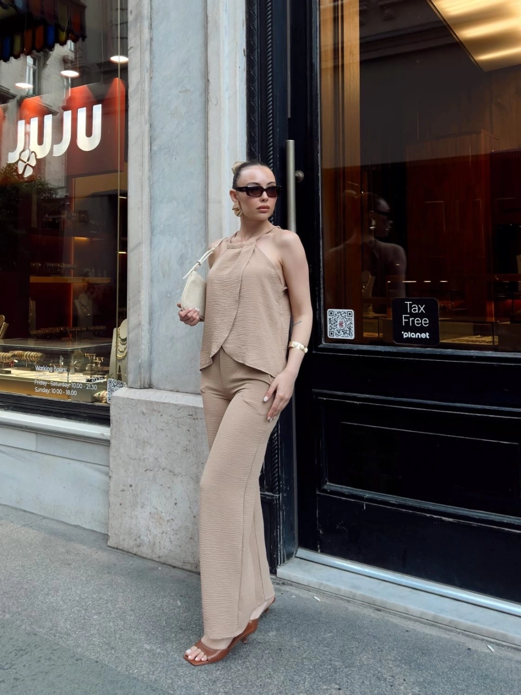 Gömlek yaka kaplama düğmeli takım kahve st265866