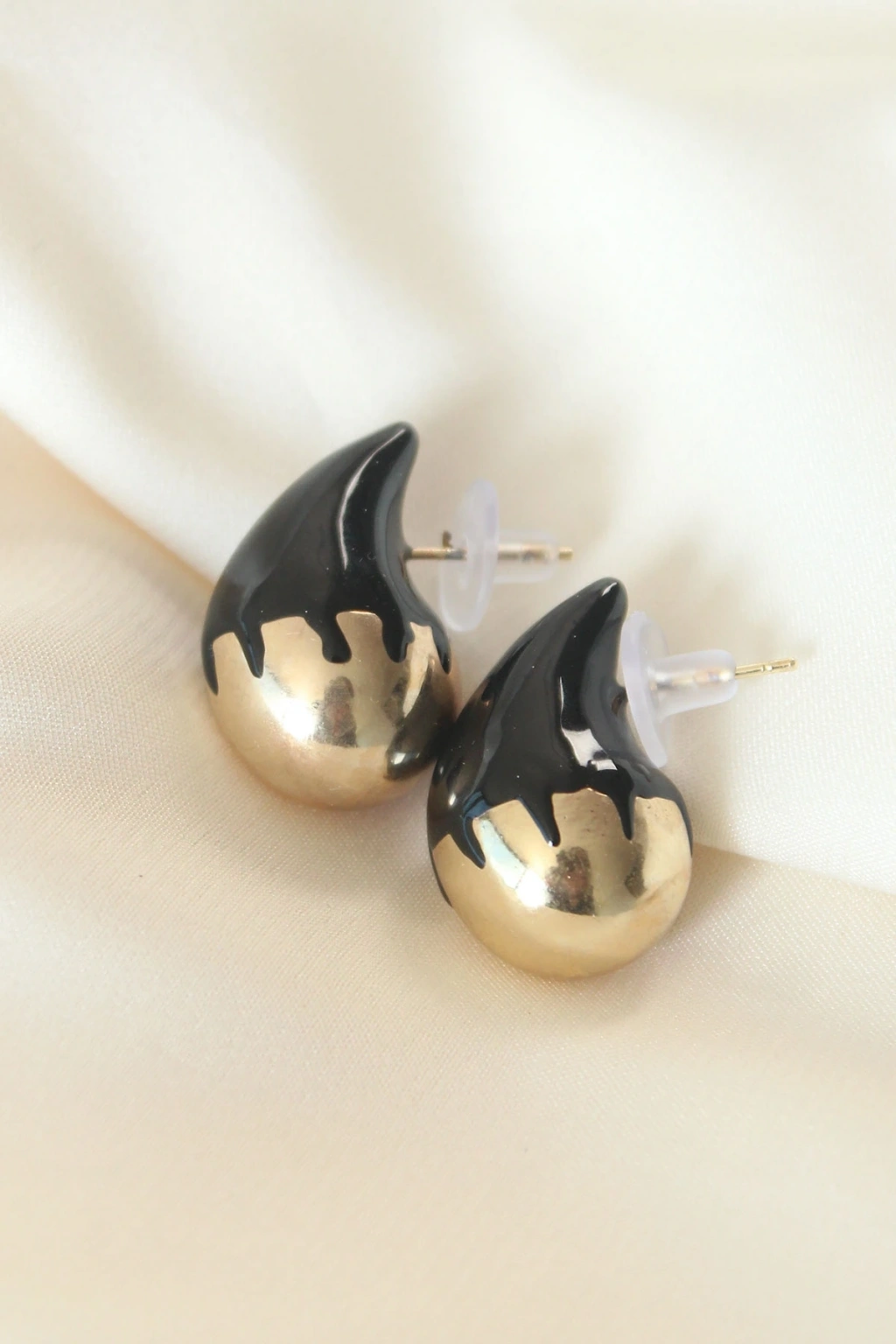 Minimal Siyah Mineli Çift Renk Damla Küpe