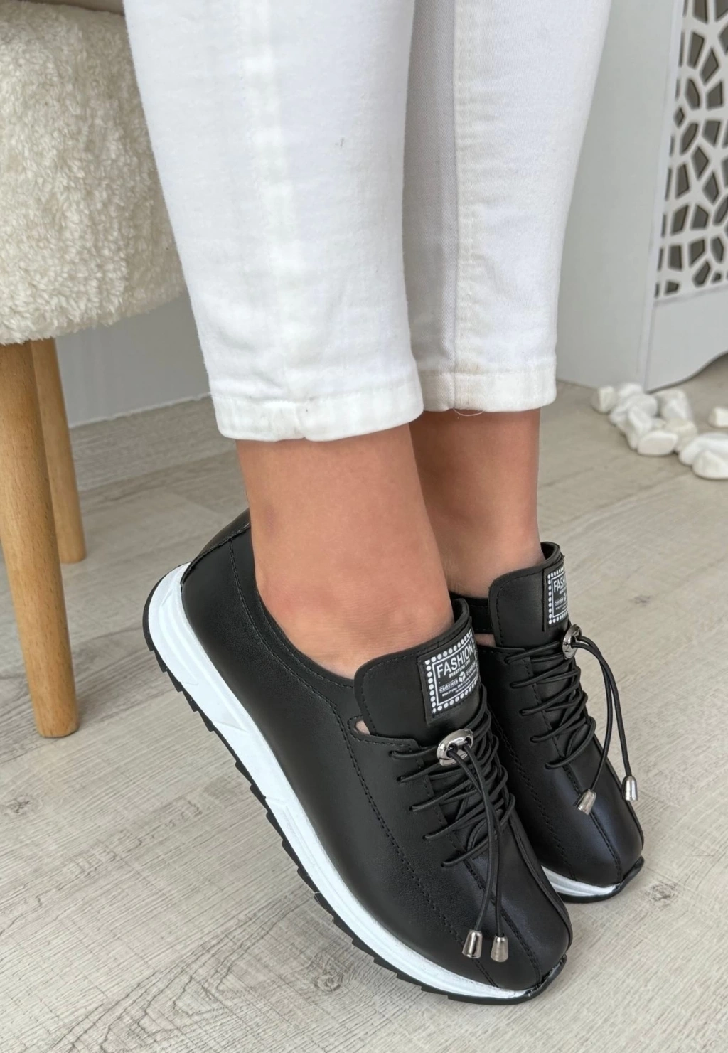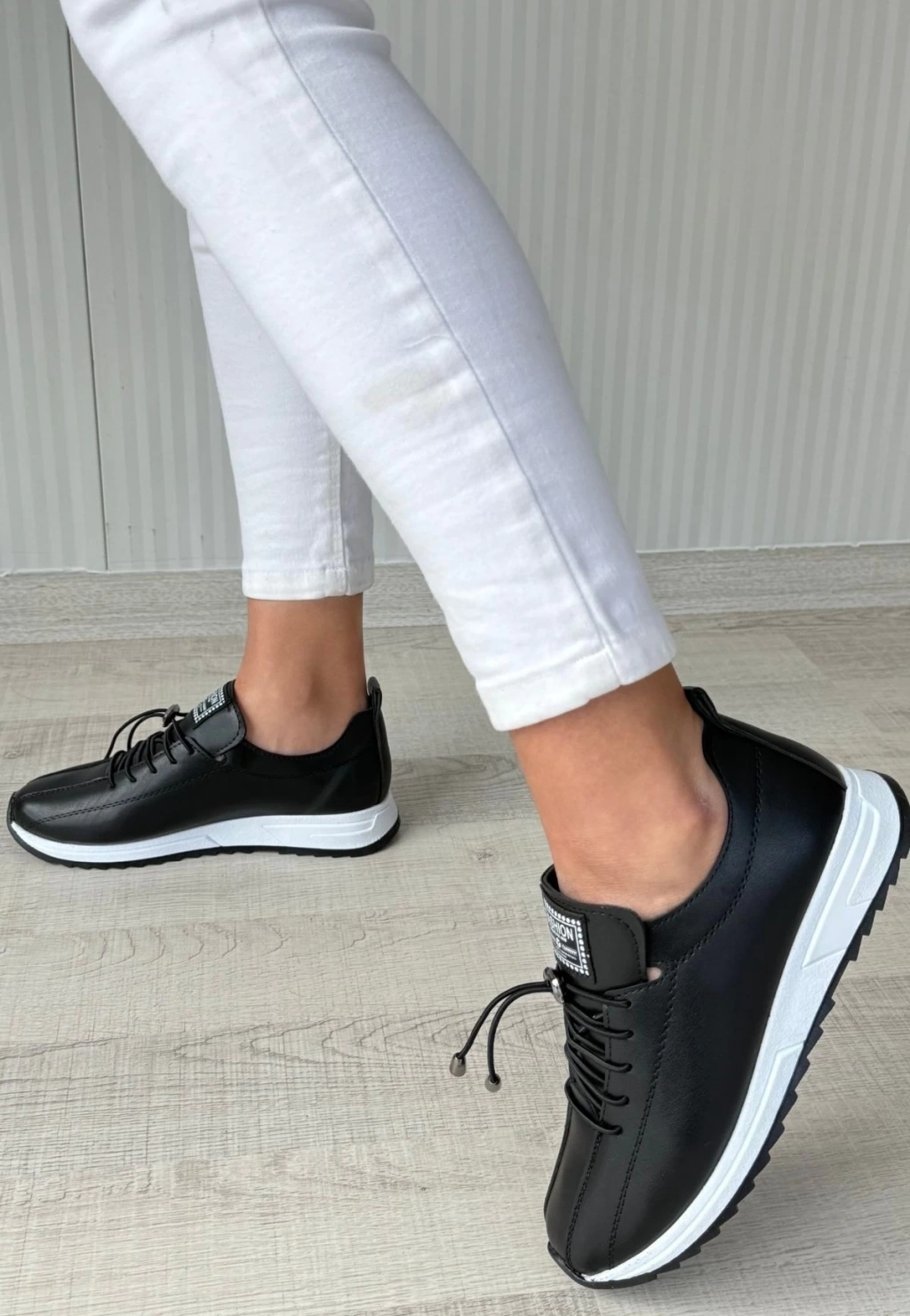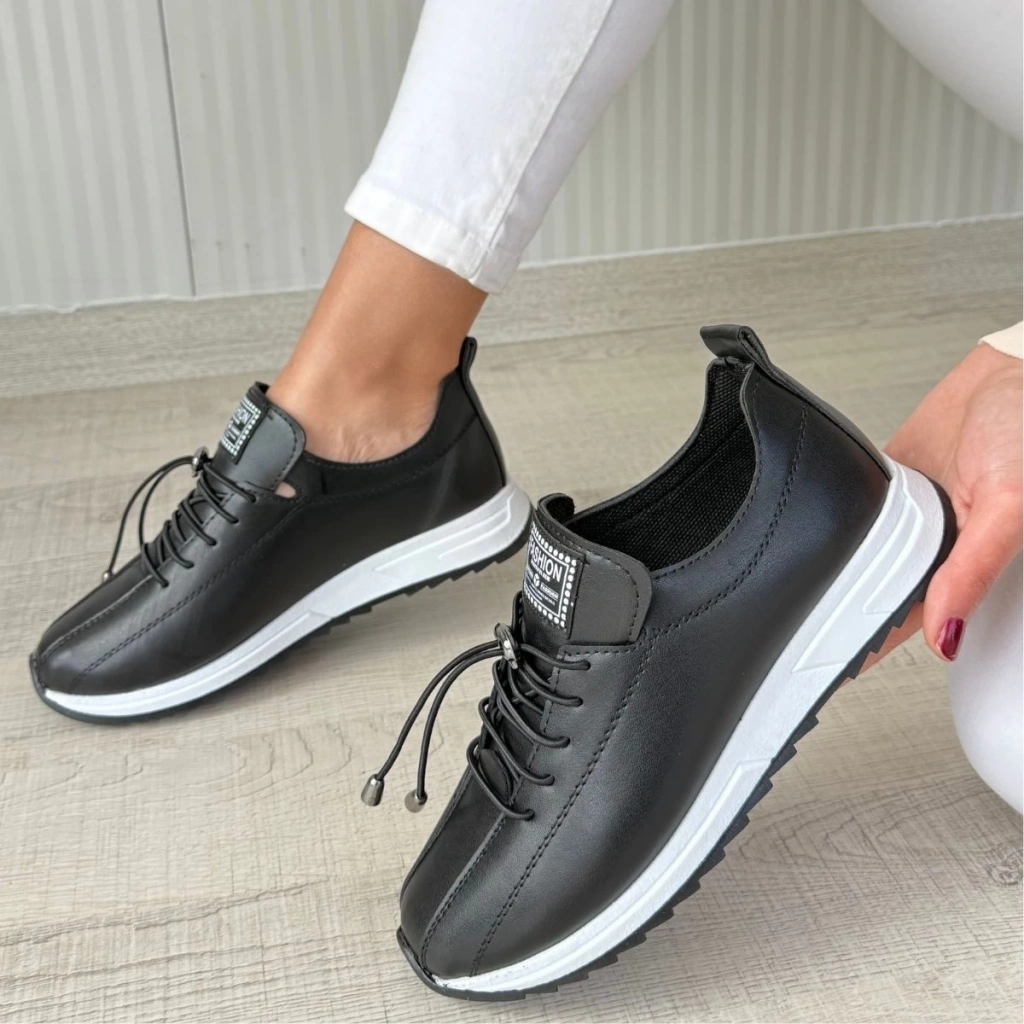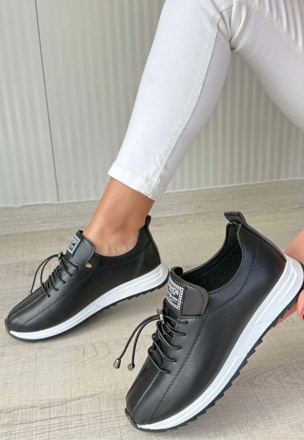 Monya Siyah Cilt Bağcıklı Spor Ayakkabı