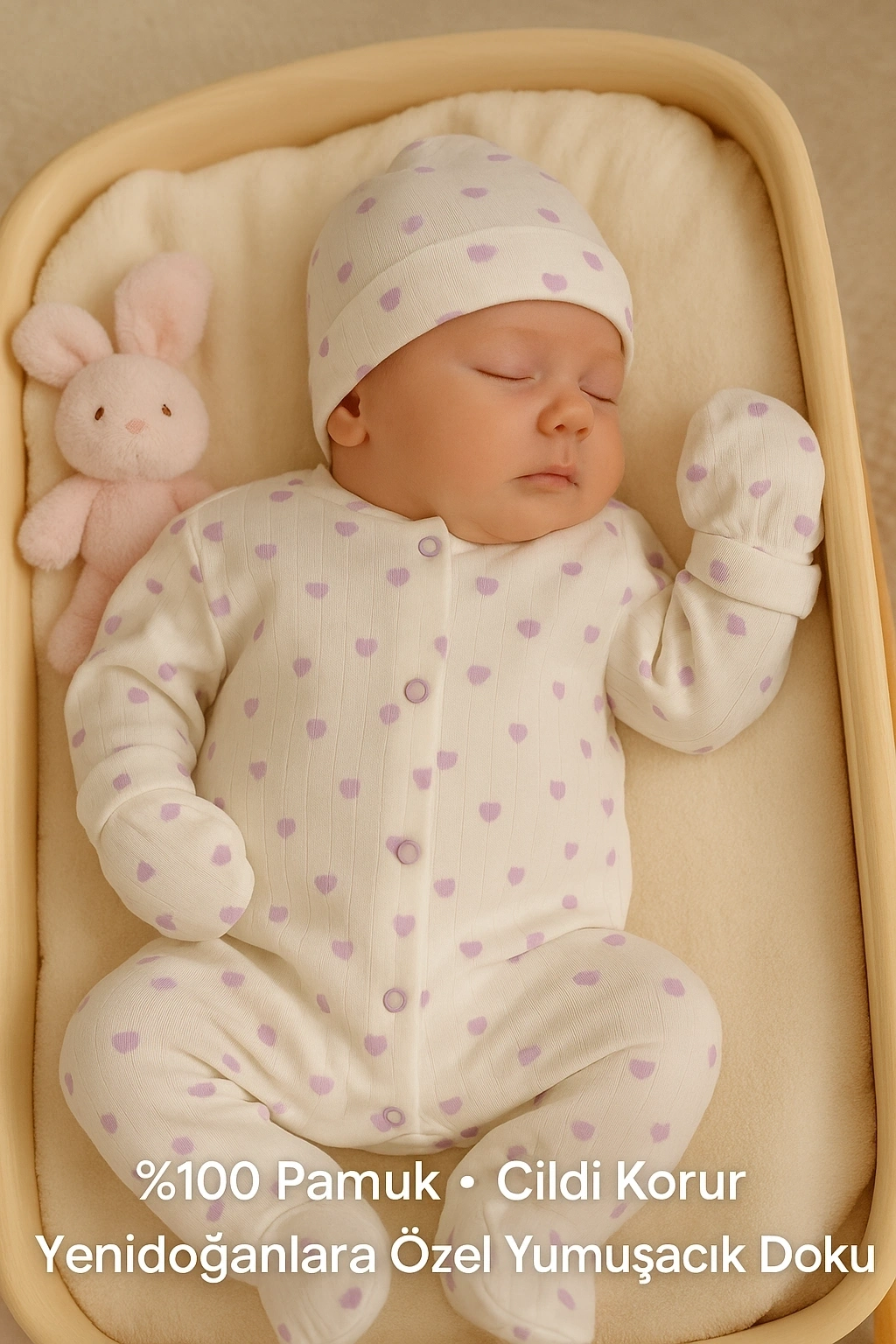 Sevimli Tavşan Figürlü Puantiyeli Bebek 5'li Hastane Çıkışı Seti Pamuk Yenidoğan Zıbın Takımı