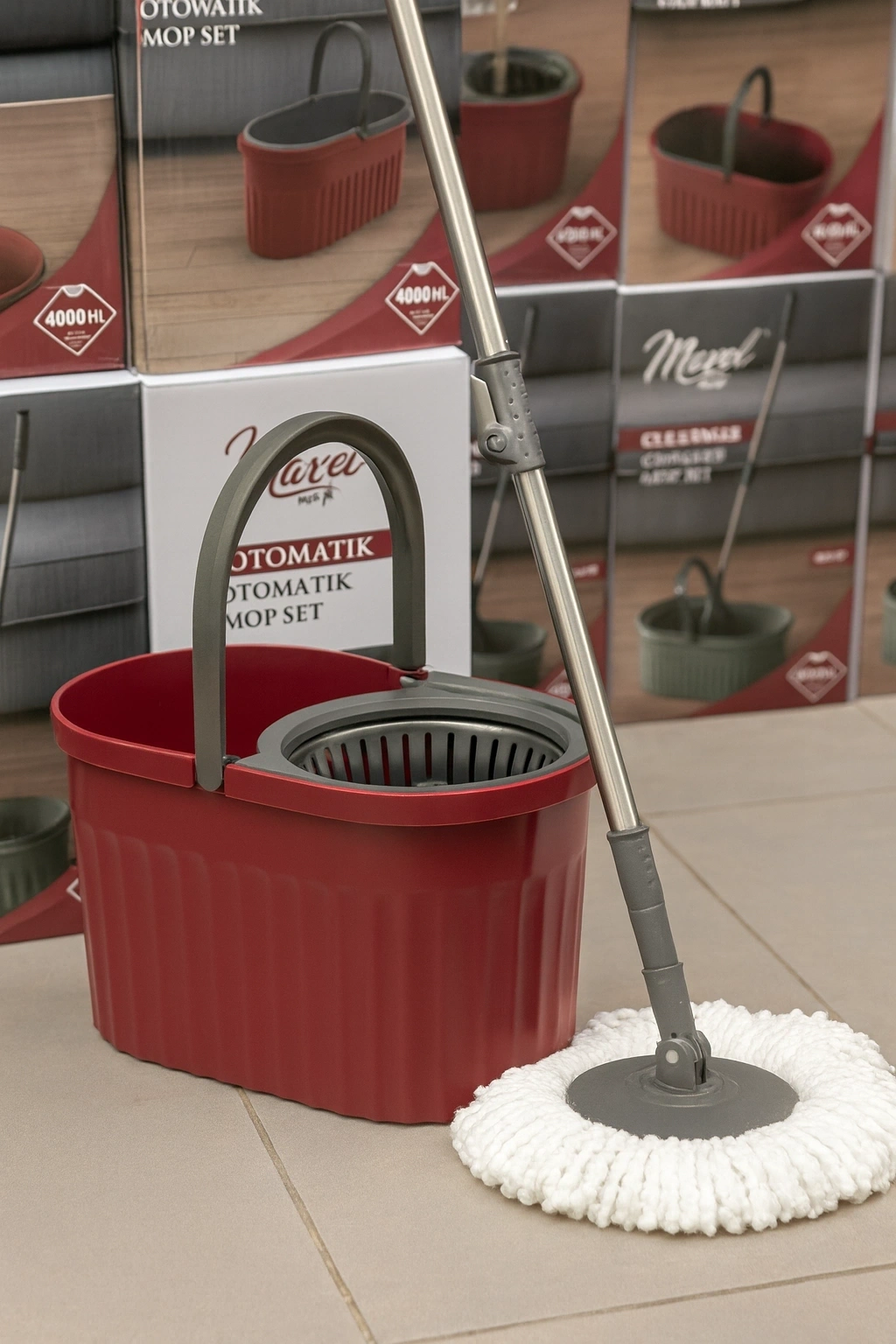 Otomatik Mop Seti Paspas ve Sıkma Kovası, 360° Döner Başlıklı Mikrofiber Yer Temizleme Bordo