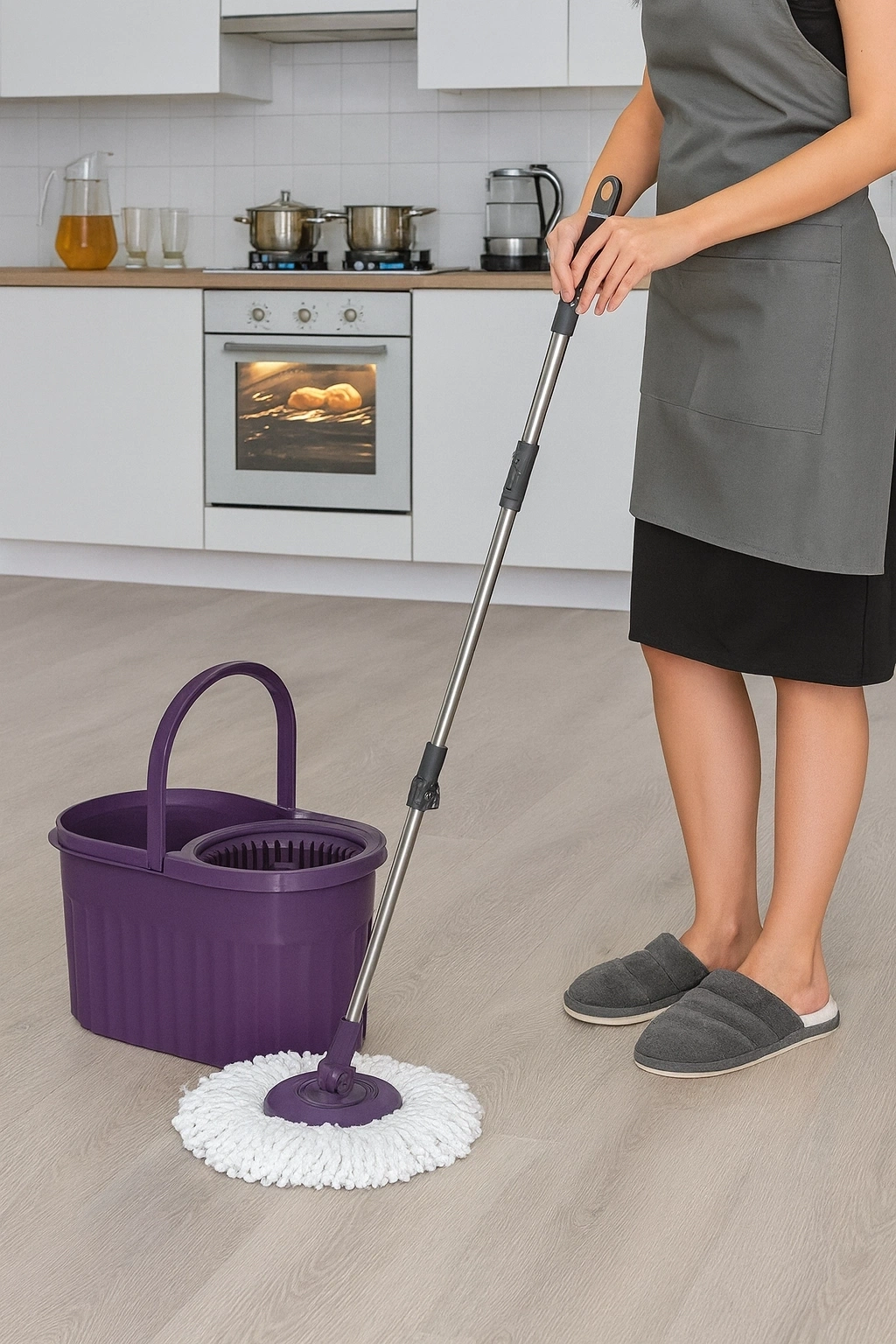 Otomatik Mop Seti Paspas ve Sıkma Kovası, 360° Döner Başlıklı Mikrofiber Yer Temizleme Mor
