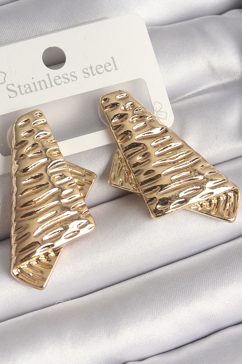 Pirinç Gold Renk İşleme Detaylı Katlanmış Kare Plaka Model Kadın Küpe