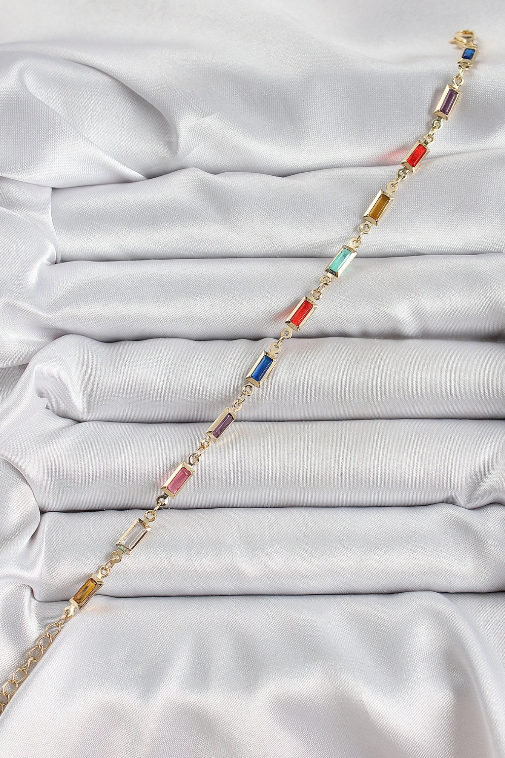 Pirinç Gold Renk Karışık Renkli Kare Zirkon Taşlı Kadın Bileklik