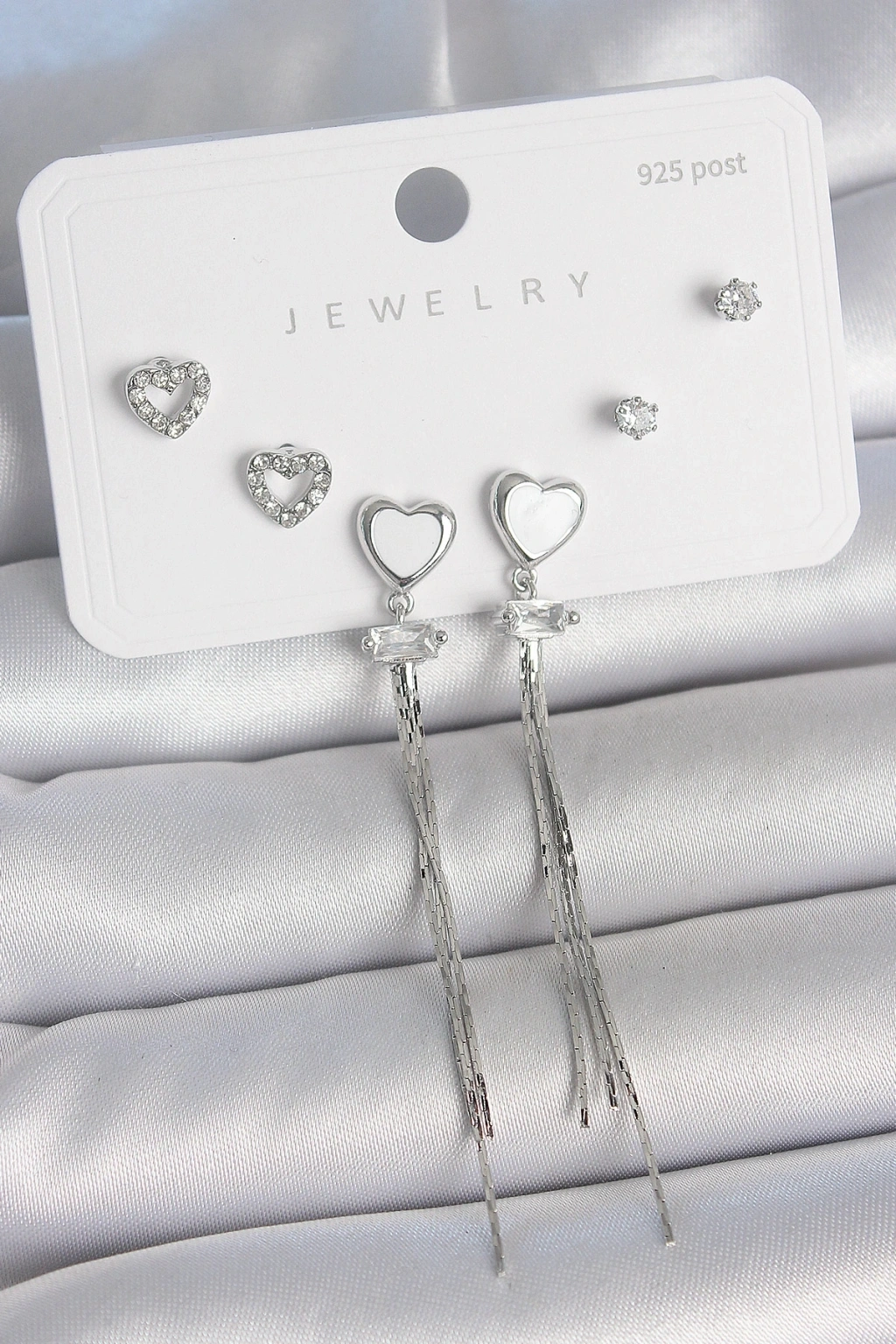 Pirinç Gümüş Sallantı Beyaz Mineli Kalp Model Zirkon Taşlı Kalp Detay 925 Ayar Gümüş Çivi Kadın Küpe Seti