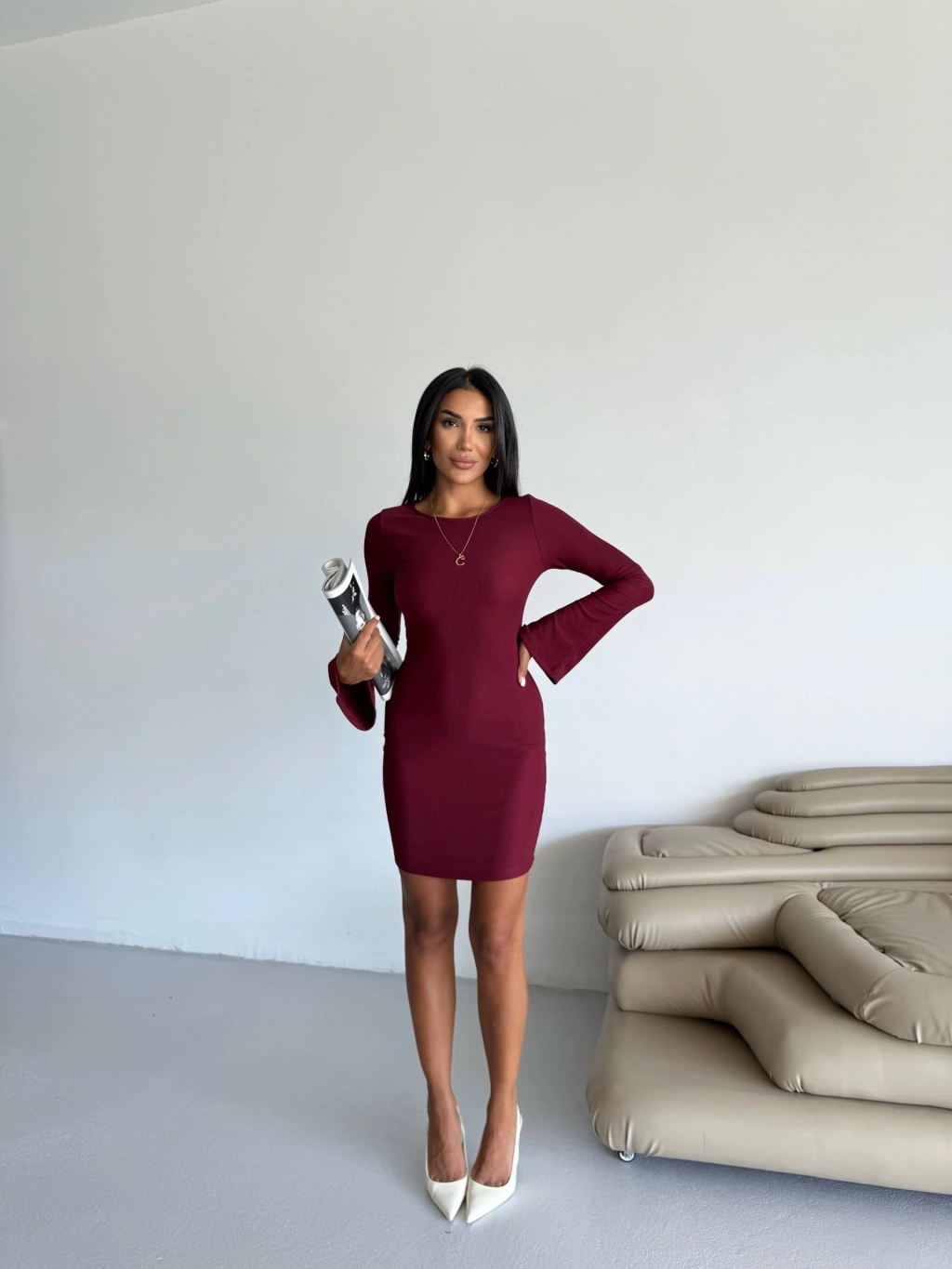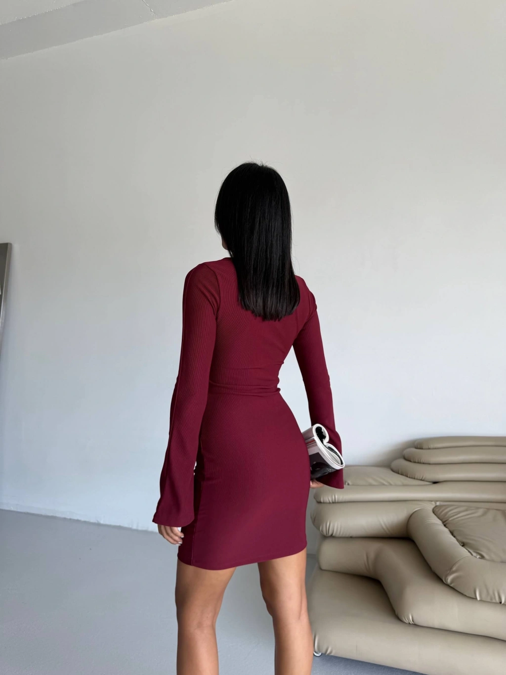 Fermuar detaylı fitilli şardonlu elbise bordo a3178